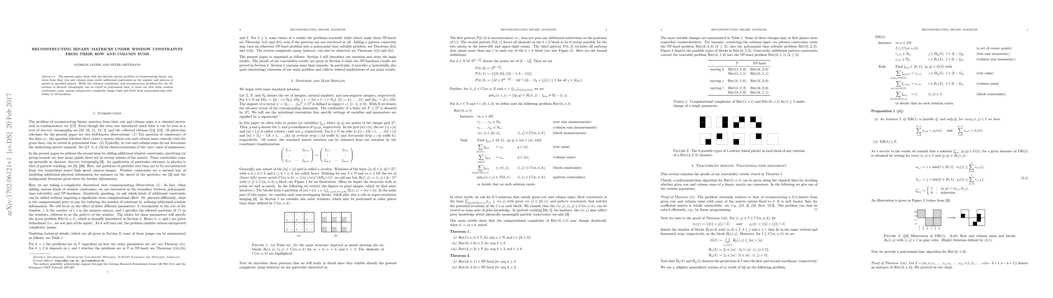 This paper addresses the complexity of reconstructing binary matrices from row and column sums, with additional constraints on specified minors, revealing unexpected complexity shifts between polynomial-time solvability and $\mathbb{N}\mathbb{P}$-hardness due to these window constraints.