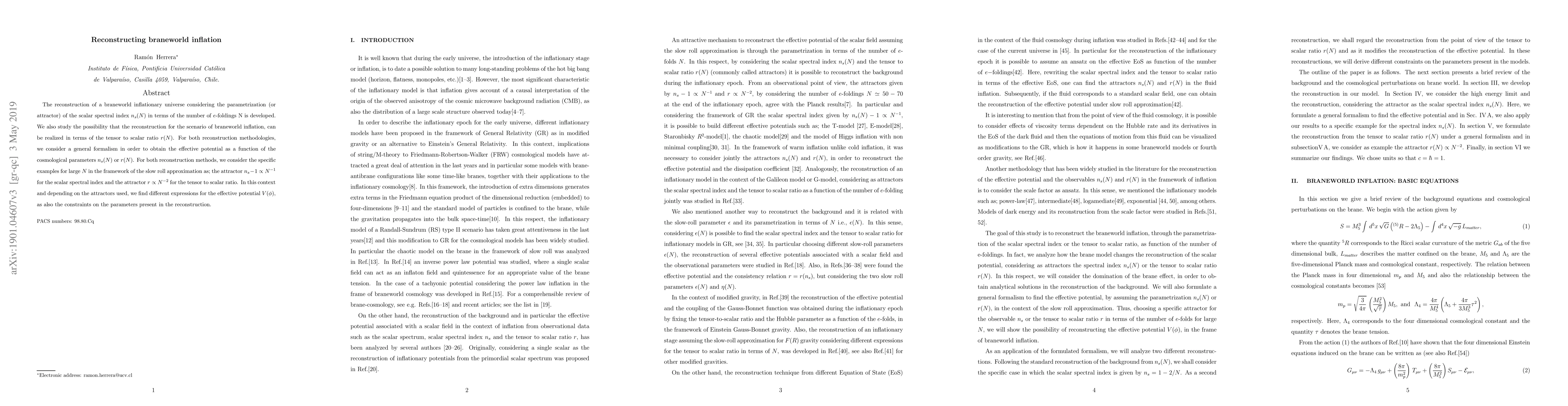 This paper reconstructs braneworld inflation by analyzing the scalar spectral index $n_s$ and tensor to scalar ratio $r$ in terms of $e$-foldings $N$. It develops a general formalism to obtain the effective potential, considering specific attractors for large $N$ and deriving constraints on cosmological parameters.
