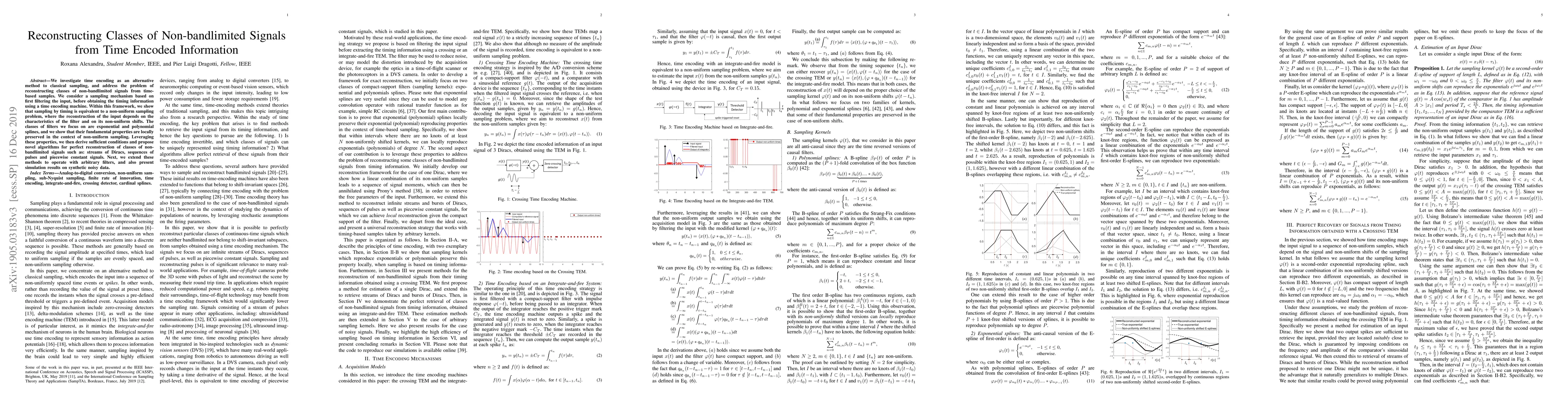 This paper explores time encoding as an alternative to classical sampling for reconstructing non-bandlimited signals, demonstrating that timing-based sampling equates to a non-uniform sampling problem. It proposes algorithms for perfect reconstruction of specific signal classes using exponential and polynomial spline filters, and extends these methods to work with arbitrary filters.