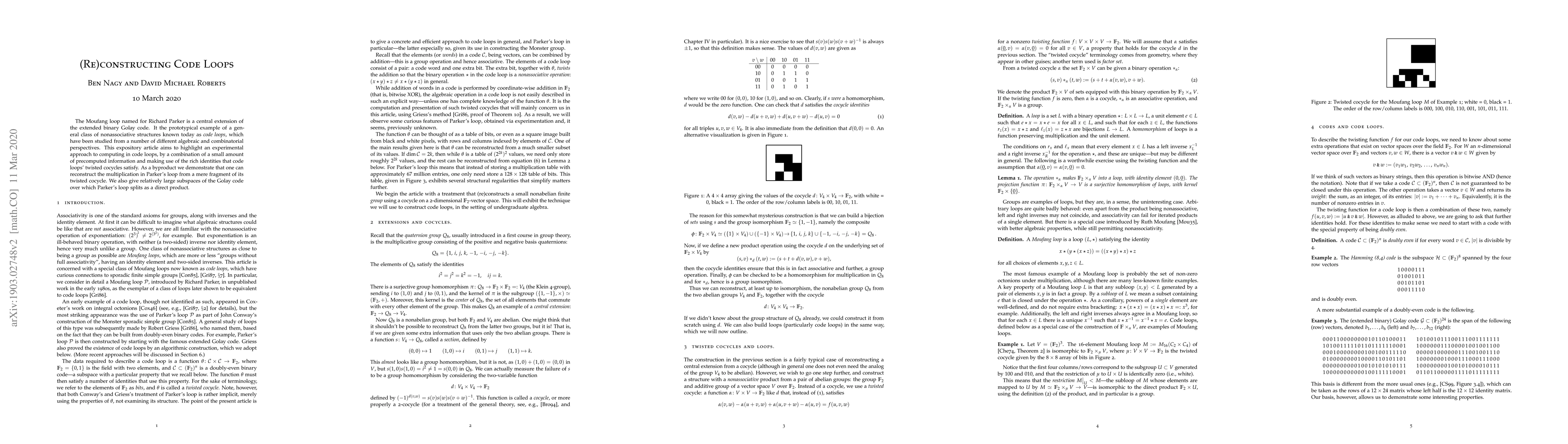 The Moufang loop named for Richard Parker is a central extension of the extended binary Golay code. It the prototypical example of a general class of nonassociative structures known today as code loops, which have been studied from a number of different algebraic and combinatorial perspectives. This expository article aims to highlight an experimental approach to computing in code loops, by a combination of a small amount of precomputed information and making use of the rich identities that code loops' twisted cocycles satisfy. As a byproduct we demonstrate that one can reconstruct the multiplication in Parker's loop from a mere fragment of its twisted cocycle. We also give relatively large subspaces of the Golay code over which Parker's loop splits as a direct product.