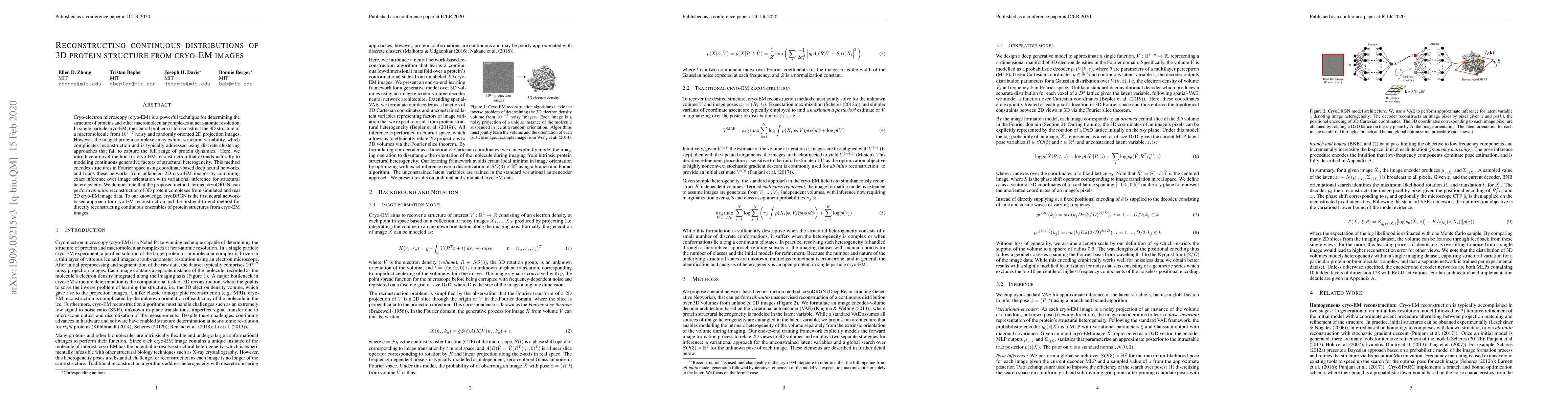 This paper introduces cryoDRGN, a novel neural network-based method for reconstructing continuous 3D protein structures from cryo-EM images, addressing structural variability without discrete clustering. It combines Fourier space encoding and variational inference to model structural heterogeneity directly from unlabeled 2D images.
