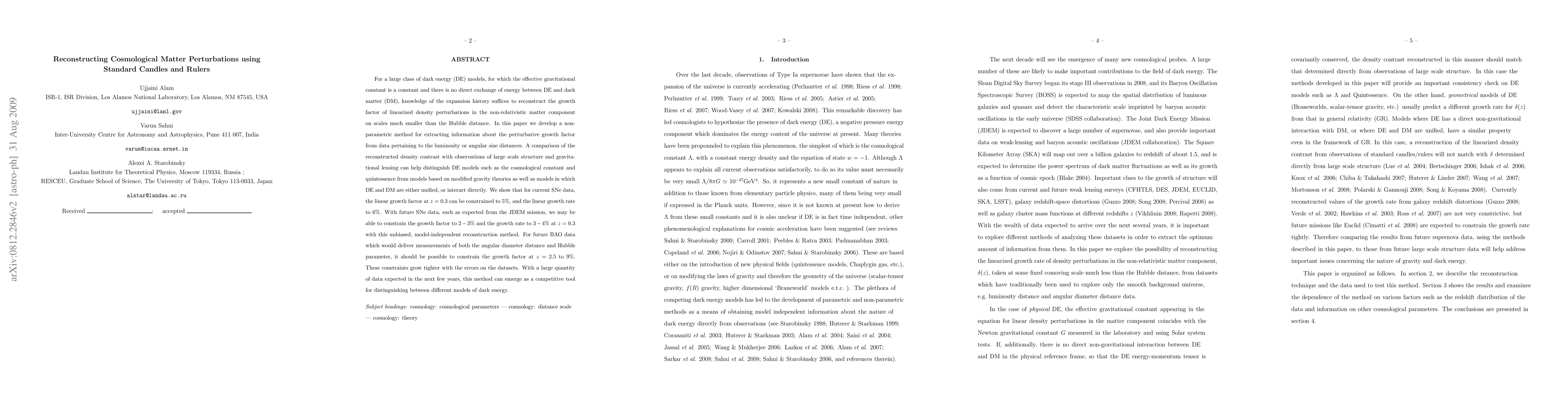 This paper develops a non-parametric method to reconstruct cosmological matter perturbations using standard candles and rulers, showing that current data can constrain the linear growth factor to 5% and the growth rate to 6%. Future data from missions like JDEM and BAO could improve these constraints to 2-3% and 3-4%, respectively, aiding in distinguishing dark energy models.