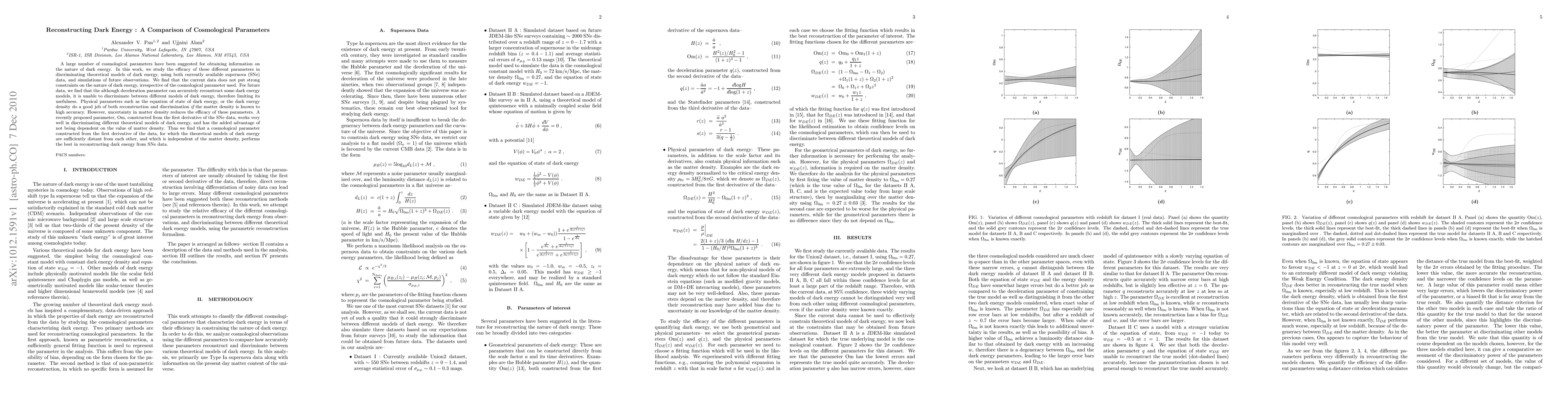 A large number of cosmological parameters have been suggested for obtaining information on the nature of dark energy. In this work, we study the efficacy of these different parameters in discriminating theoretical models of dark energy, using both currently available supernova (SNe) data, and simulations of future observations. We find that the current data does not put strong constraints on the nature of dark energy, irrespective of the cosmological parameter used. For future data, we find that the although deceleration parameter can accurately reconstruct some dark energy models, it is unable to discriminate between different models of dark energy, therefore limiting its usefulness. Physical parameters such as the equation of state of dark energy, or the dark energy density do a good job of both reconstruction and discrimination if the matter density is known to high accuracy. However, uncertainty in matter density reduces the efficacy of these parameters. A recently proposed parameter, Om(z), constructed from the first derivative of the SNe data, works very well in discriminating different theoretical models of dark energy, and has the added advantage of not being dependent on the value of matter density. Thus we find that a cosmological parameter constructed from the first derivative of the data, for which the theoretical models of dark energy are sufficiently distant from each other, and which is independent of the matter density, performs the best in reconstructing dark energy from SNe data.