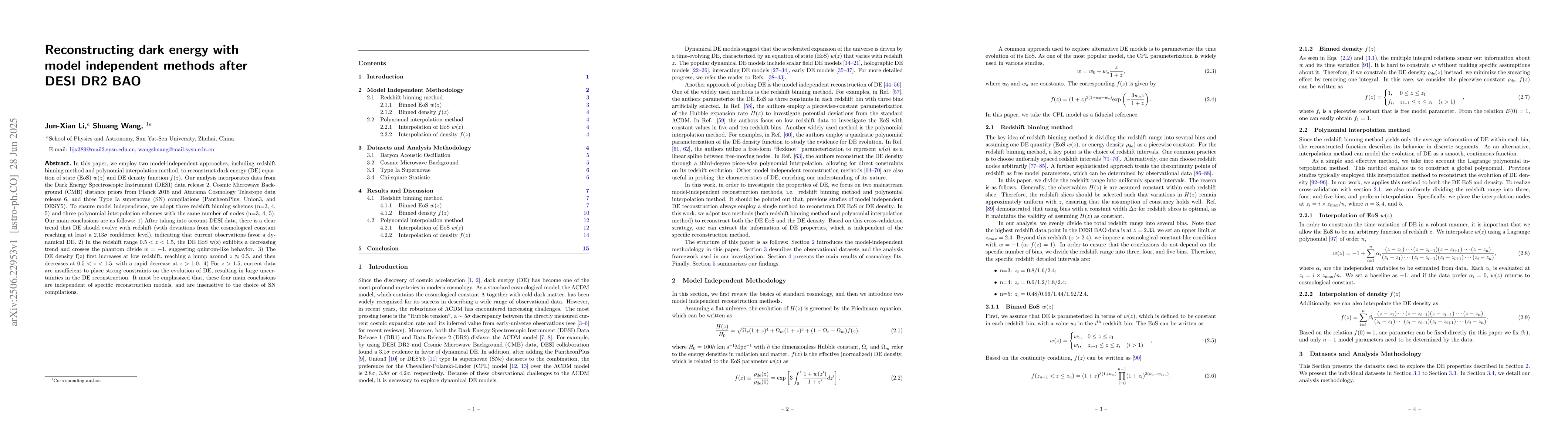 In this paper, we employ two model-independent approaches, including redshift binning method and polynomial interpolation method, to reconstruct dark energy (DE) equation of state (EoS) $w(z)$ and DE density function $f(z)$. Our analysis incorporates data from the Dark Energy Spectroscopic Instrument (DESI) data release 2, Cosmic Microwave Background (CMB) distance priors from Planck 2018 and Atacama Cosmology Telescope data release 6, and three Type Ia supernovae (SN) compilations (PantheonPlus, Union3, and DESY5). To ensure model independence, we adopt three redshift binning schemes (n=3, 4, 5) and three polynomial interpolation schemes with the same number of nodes (n=3, 4, 5). Our main conclusions are as follows: 1) After taking into account DESI data, there is a clear trend that DE should evolve with redshift (with deviations from the cosmological constant reaching at least a $2.13\sigma$ confidence level), indicating that current observations favor a dynamical DE. 2) In the redshift range $0.5 < z < 1.5$, the DE EoS w(z) exhibits a decreasing trend and crosses the phantom divide $w=-1$, suggesting quintom-like behavior. 3) The DE density f(z) first increases at low redshift, reaching a hump around $z\approx 0.5$, and then decreases at $0.5 < z < 1.5$, with a rapid decrease at $z>1.0$. 4) For $z > 1.5$, current data are insufficient to place strong constraints on the evolution of DE, resulting in large uncertainties in the DE reconstruction. It must be emphasized that, these four main conclusions are independent of specific reconstruction models, and are insensitive to the choice of SN compilations.