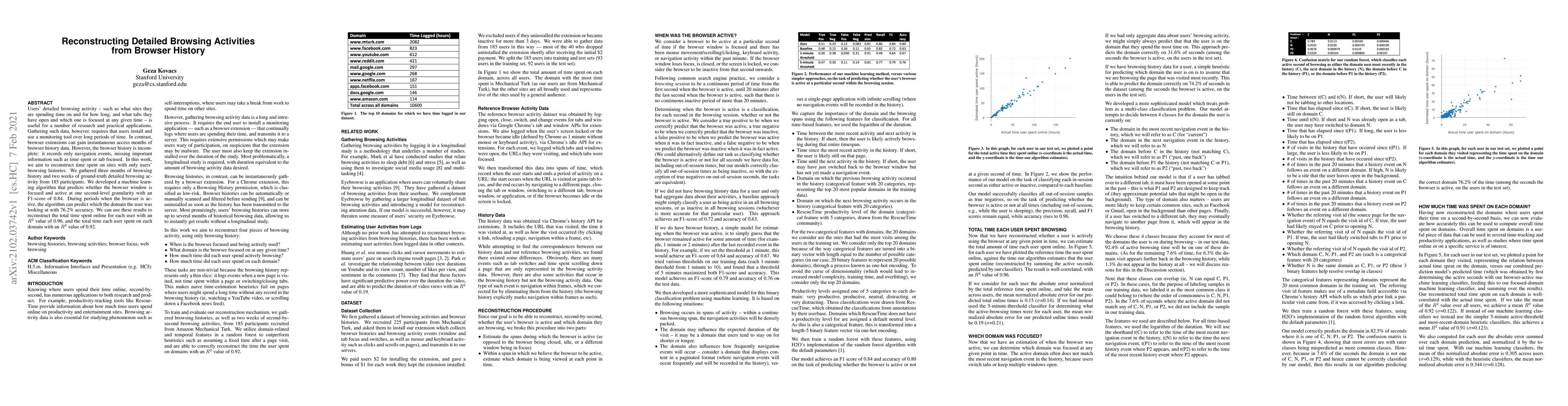 This research reconstructs detailed browsing activities using only browser history, achieving 84% accuracy in predicting focused domains and 96% accuracy in estimating total online time. It utilizes a machine learning algorithm trained on three months of browsing history and two weeks of ground-truth data from 185 participants.