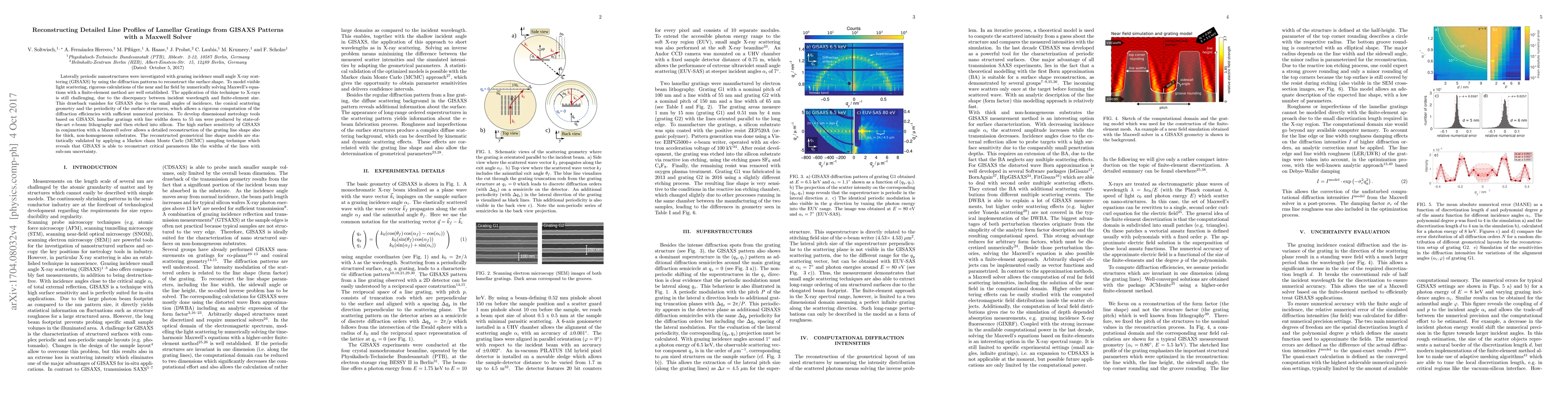 This paper presents a method for reconstructing detailed line profiles of lamellar gratings using grazing incidence small angle X-ray scattering (GISAXS) and a Maxwell solver to model light scattering. The technique accurately determines critical parameters like line widths with sub-nm precision, validated by a Markov chain Monte Carlo sampling technique.