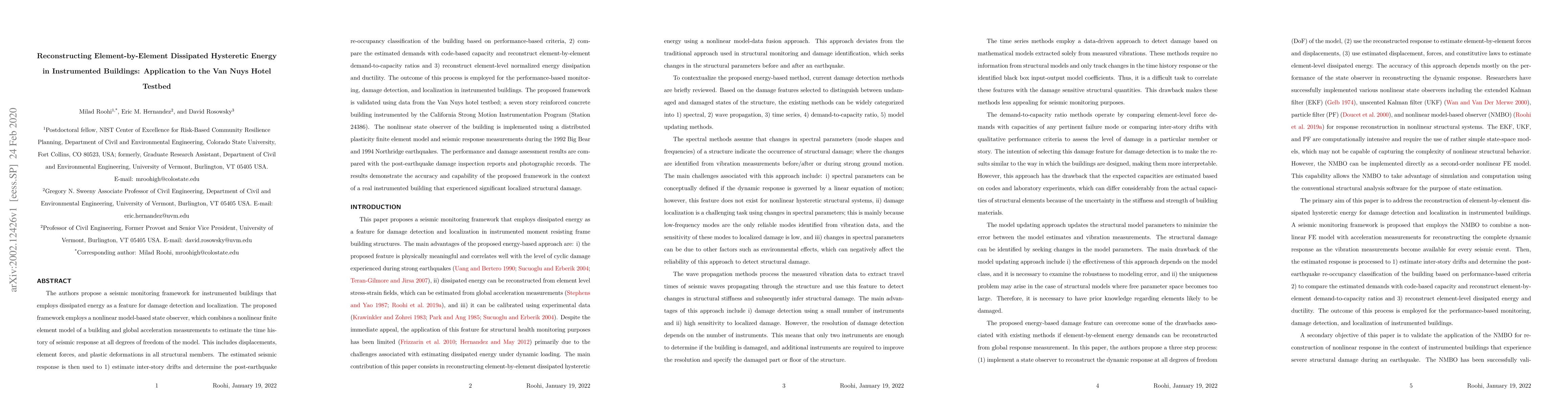 The paper proposes a seismic monitoring framework for instrumented buildings using dissipated hysteretic energy for damage detection and localization. It validates the framework using data from the Van Nuys hotel testbed, demonstrating its accuracy in assessing performance and localized structural damage post-earthquake.
