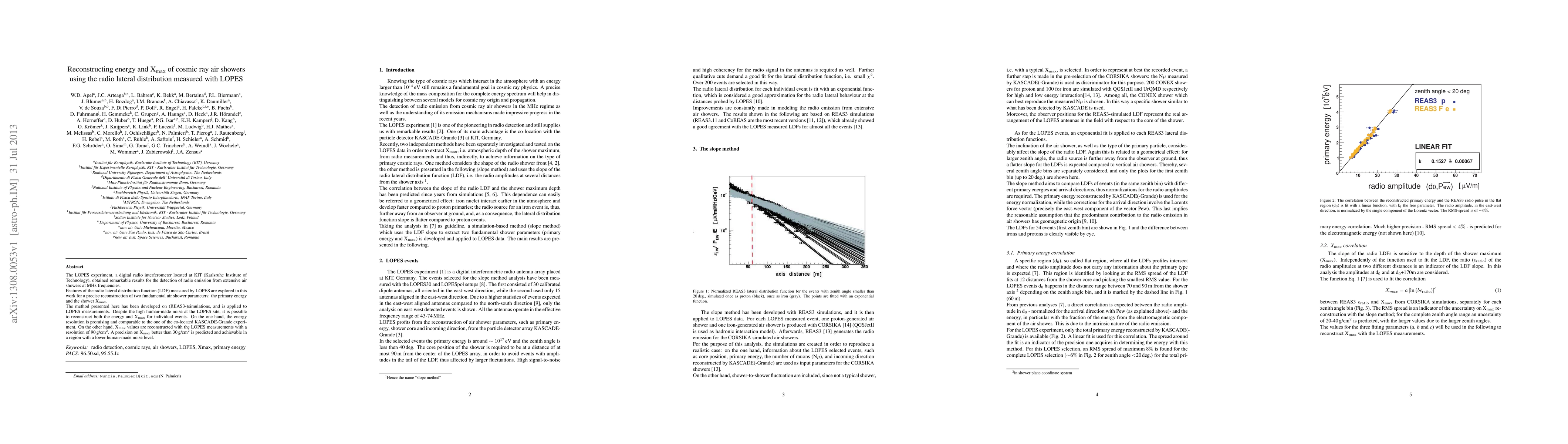This paper explores the LOPES experiment's radio lateral distribution function to reconstruct the primary energy and Xmax of cosmic ray air showers. The method shows promising energy resolution and achieves Xmax reconstruction with a resolution of 90 g/cm2, with potential for even higher precision in quieter environments.