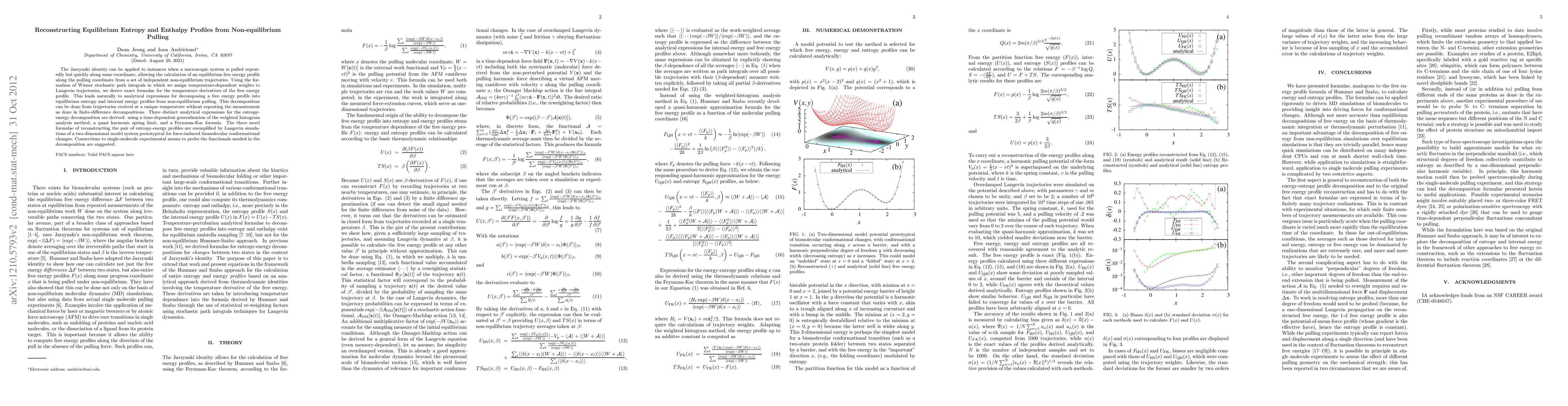 This paper reconstructs equilibrium entropy and enthalpy profiles from non-equilibrium pulling using the Jarzynski identity and Wiener stochastic path integrals. It derives analytical expressions for entropy-energy decomposition from a single temperature trajectory, exemplified by simulations of a two-dimensional model system.