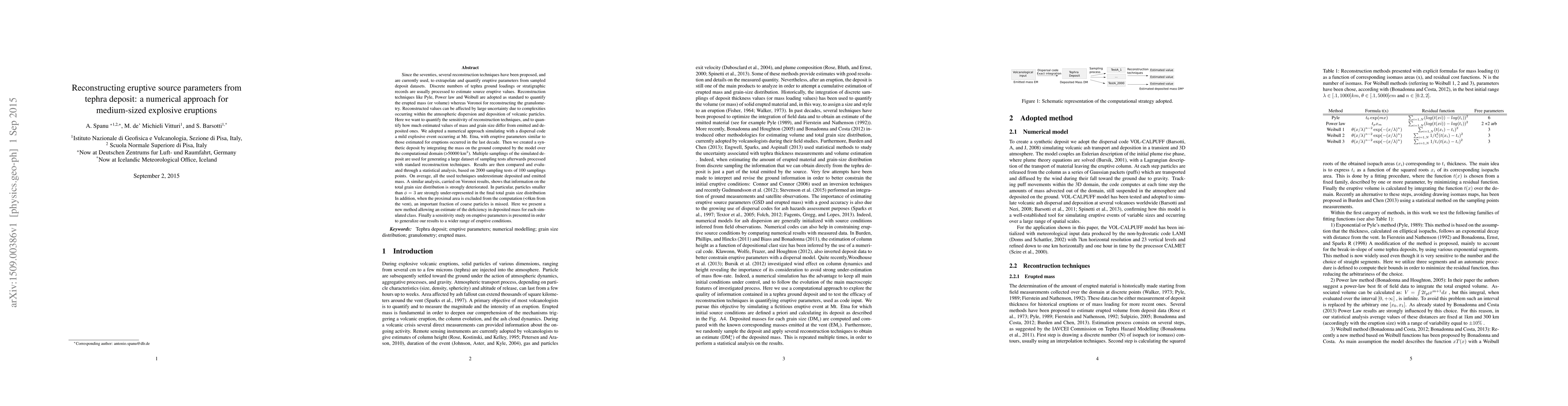 Since the seventies, several reconstruction techniques have been proposed, and are currently used, to extrapolate and quantify eruptive parameters from sampled deposit datasets. Discrete numbers of tephra ground loadings or stratigraphic records are usually processed to estimate source eruptive values. Reconstruction techniques like Pyle, Power law and Weibull are adopted as standard to quantify the erupted mass (or volume) whereas Voronoi for reconstructing the granulometry. Reconstructed values can be affected by large uncertainty due to complexities occurring within the atmospheric dispersion and deposition of volcanic particles. Here we want to quantify the sensitivity of reconstruction techniques, and to quantify how much estimated values of mass and grain size differ from emitted and deposited ones. We adopted a numerical approach simulating with a dispersal code a mild explosive event occurring at Mt. Etna, with eruptive parameters similar to those estimated for eruptions occurred in the last decade. Then we created a synthetic deposit by integrating the mass on the ground computed by the model over the computational domain (>50000 km2). Multiple samplings of the simulated deposit are used for generating a large dataset of sampling tests afterwards processed with standard reconstruction techniques. Results are then compared and evaluated through a statistical analysis, based on 2000 sampling tests of 100 samplings points. On average, all the used techniques underestimate deposited and emitted mass. A similar analysis, carried on Voronoi results, shows that information on the total grain size distribution is strongly deteriorated. Here we present a new method allowing an estimate of the deficiency in deposited mass for each simulated class. Finally a sensitivity study on eruptive parameters is presented in order to generalize our results to a wider range of eruptive conditions.