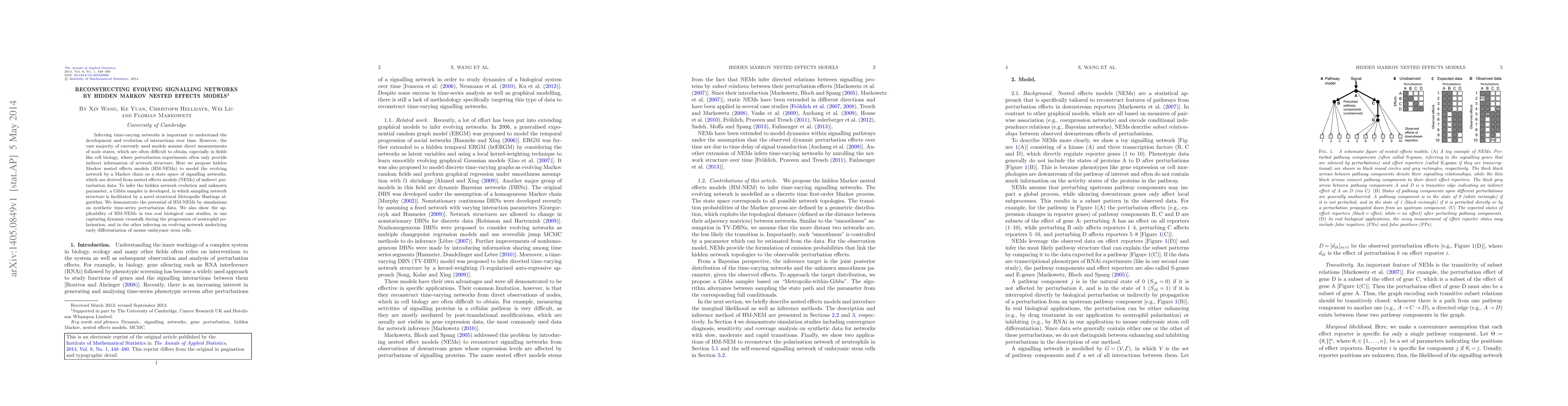 Inferring time-varying networks is important to understand the development and evolution of interactions over time. However, the vast majority of currently used models assume direct measurements of node states, which are often difficult to obtain, especially in fields like cell biology, where perturbation experiments often only provide indirect information of network structure. Here we propose hidden Markov nested effects models (HM-NEMs) to model the evolving network by a Markov chain on a state space of signalling networks, which are derived from nested effects models (NEMs) of indirect perturbation data. To infer the hidden network evolution and unknown parameter, a Gibbs sampler is developed, in which sampling network structure is facilitated by a novel structural Metropolis--Hastings algorithm. We demonstrate the potential of HM-NEMs by simulations on synthetic time-series perturbation data. We also show the applicability of HM-NEMs in two real biological case studies, in one capturing dynamic crosstalk during the progression of neutrophil polarisation, and in the other inferring an evolving network underlying early differentiation of mouse embryonic stem cells.