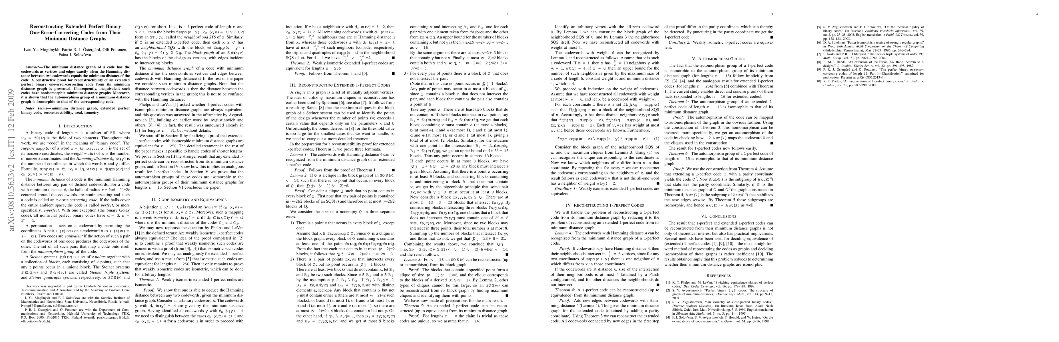 Researchers developed a method to reconstruct extended perfect binary one-error-correcting codes from their minimum distance graphs, showing that different codes with the same properties have unique graph structures.