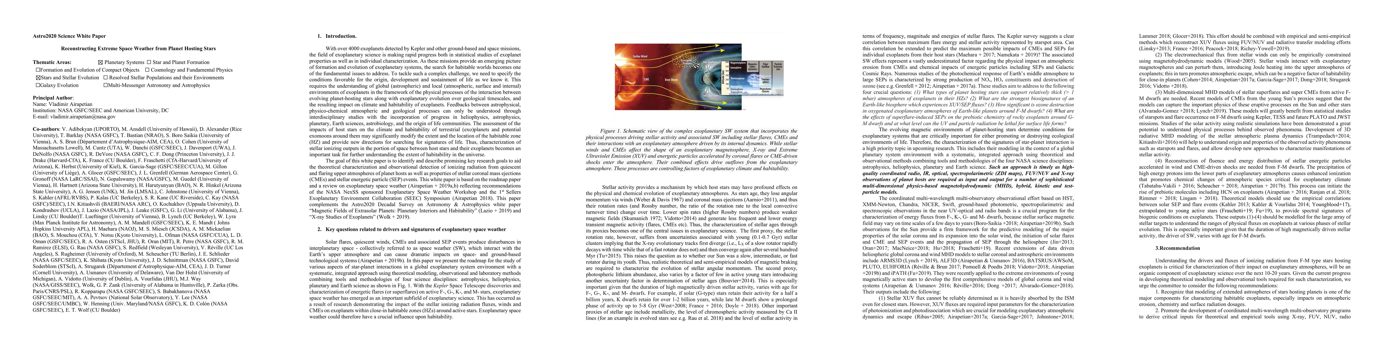 The field of exoplanetary science is making rapid progress both in statistical studies of exoplanet properties as well as in individual characterization. As space missions provide an emerging picture of formation and evolution of exoplanetary systems, the search for habitable worlds becomes one of the fundamental issues to address. To tackle such a complex challenge, we need to specify the conditions favorable for the origin, development and sustainment of life as we know it. This requires the understanding of global (astrospheric) and local (atmospheric, surface and internal) environments of exoplanets in the framework of the physical processes of the interaction between evolving planet-hosting stars along with exoplanetary evolution over geological timescales, and the resulting impact on climate and habitability of exoplanets. Feedbacks between astrophysical, physico-chemical atmospheric and geological processes can only be understood through interdisciplinary studies with the incorporation of progress in heliophysics, astrophysics, planetary, Earth sciences, astrobiology, and the origin of life communities. The assessment of the impacts of host stars on the climate and habitability of terrestrial (exo)planets and potential exomoons around them may significantly modify the extent and the location of the habitable zone and provide new directions for searching for signatures of life. Thus, characterization of stellar ionizing outputs becomes an important task for further understanding the extent of habitability in the universe. The goal of this white paper is to identify and describe promising key research goals to aid the theoretical characterization and observational detection of ionizing radiation from quiescent and flaring upper atmospheres of planet hosts as well as properties of stellar coronal mass ejections and stellar energetic particle events.