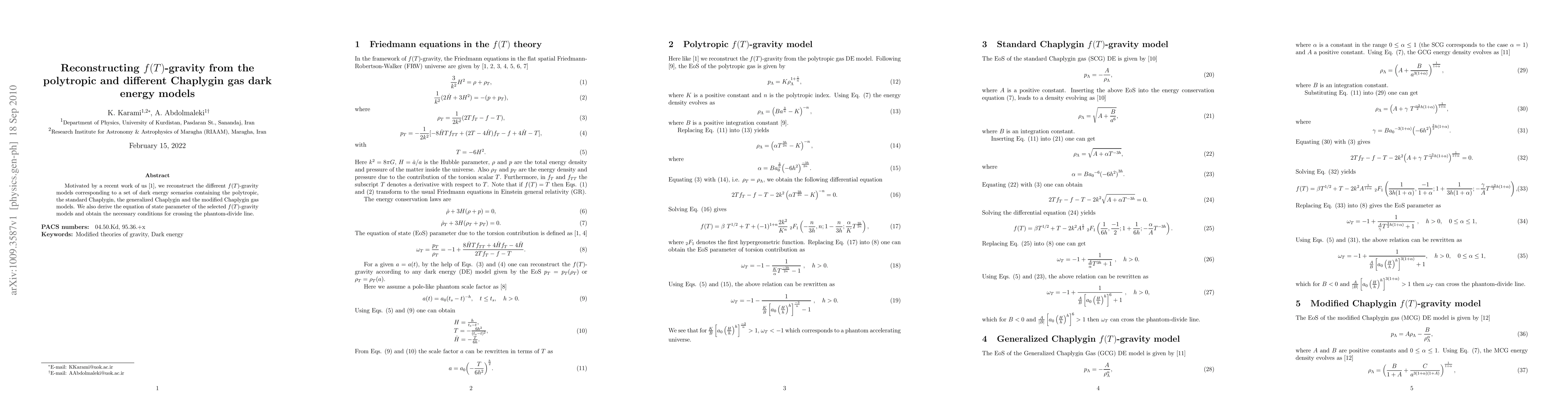 This paper reconstructs various f(T)-gravity models corresponding to different Chaplygin and polytropic gas dark energy scenarios, deriving their equation of state parameters and conditions for crossing the phantom-divide line.