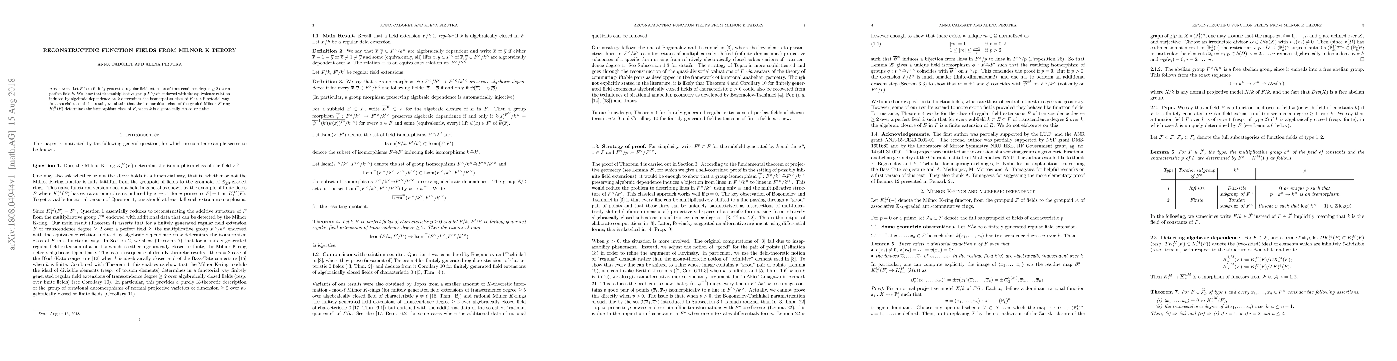 Let $F$ be a finitely generated regular field extension of transcendence degree $\geq 2$ over a perfect field $k$. We show that the multiplicative group $F^\times/k^\times$ endowed with the equivalence relation induced by algebraic dependence on $k$ determines the isomorphism class of $F$ in a functorial way. As a special case of this result, we obtain that the isomorphism class of the graded Milnor $K$-ring $K^M_*(F)$ determines the isomorphism class of $F$, when $k$ is algebraically closed or finite.