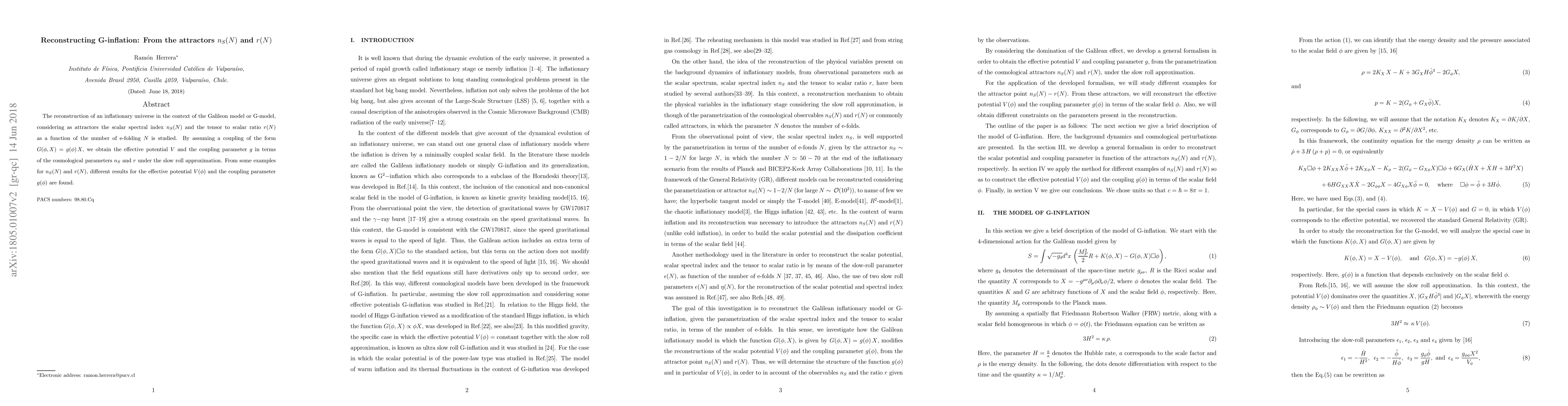 The reconstruction of an inflationary universe in the context of the Galileon model or G-model, considering as attractors the scalar spectral index $n_S(N)$ and the tensor to scalar ratio $r(N)$ as a function of the number of e-folding $N$ is studied. By assuming a coupling of the form $G(\phi,X)=g(\phi)\,X$, we obtain the effective potential $V$ and the coupling parameter $g$ in terms of the cosmological parameters $n_S$ and $r$ under the slow roll approximation. From some examples for $n_S(N)$ and $r(N)$, different results for the effective potential $V(\phi)$ and the coupling parameter $g(\phi)$ are found.