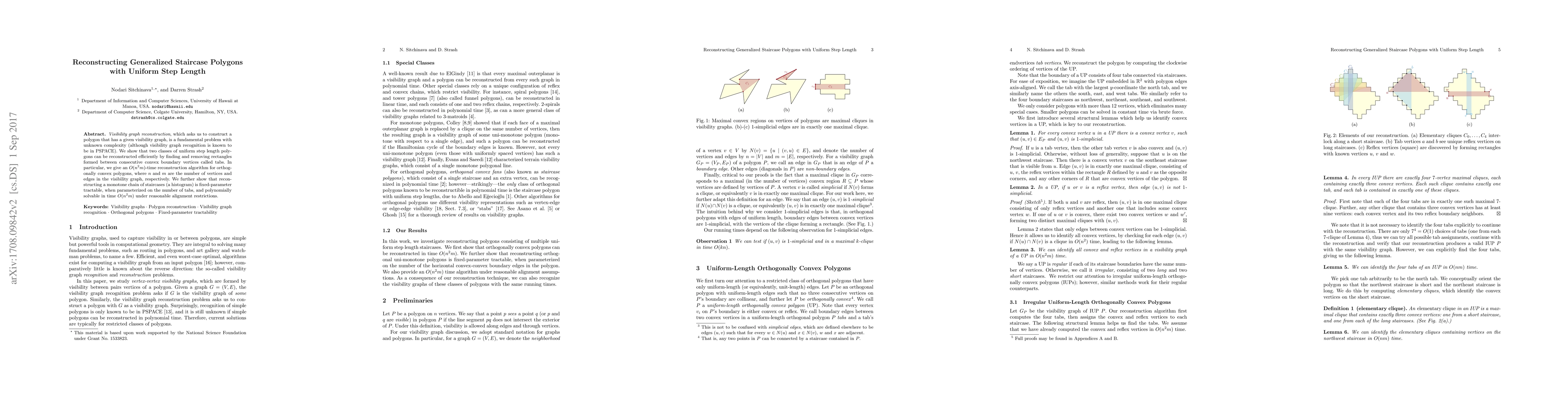 Visibility graph reconstruction, which asks us to construct a polygon that has a given visibility graph, is a fundamental problem with unknown complexity (although visibility graph recognition is known to be in PSPACE). We show that two classes of uniform step length polygons can be reconstructed efficiently by finding and removing rectangles formed between consecutive convex boundary vertices called tabs. In particular, we give an $O(n^2m)$-time reconstruction algorithm for orthogonally convex polygons, where $n$ and $m$ are the number of vertices and edges in the visibility graph, respectively. We further show that reconstructing a monotone chain of staircases (a histogram) is fixed-parameter tractable, when parameterized on the number of tabs, and polynomially solvable in time $O(n^2m)$ under reasonable alignment restrictions.