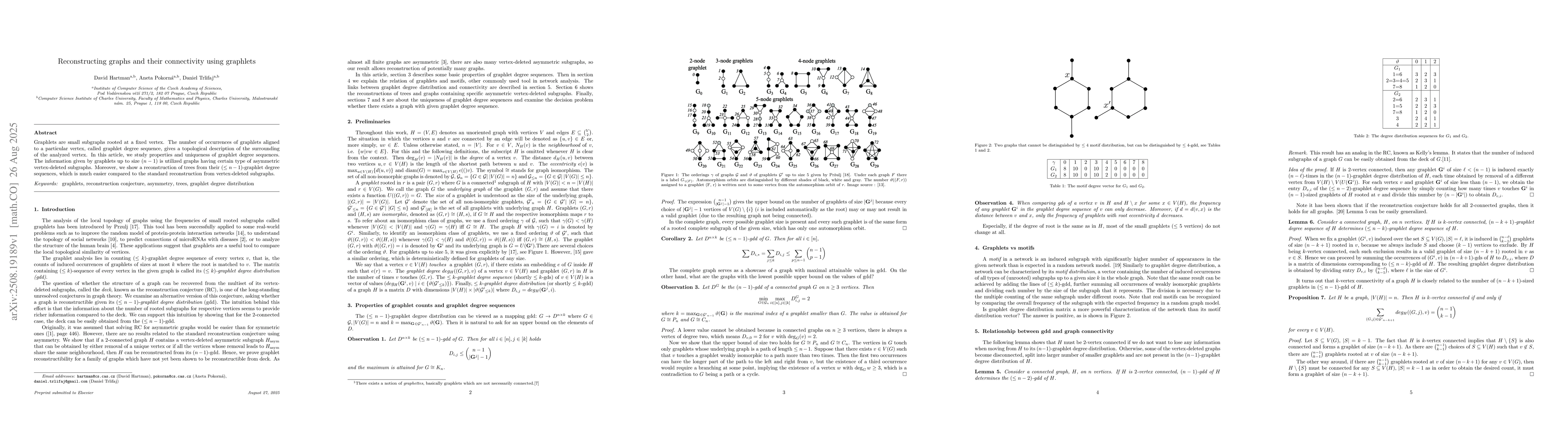 Graphlets are small subgraphs rooted at a fixed vertex. The number of occurrences of graphlets aligned to a particular vertex, called graphlet degree sequence, gives a topological description of the surrounding of the analyzed vertex. In this article, we study properties and uniqueness of graphlet degree sequences. The information given by graphlets up to size (n-1) is utilized graphs having certain type of asymmetric vertex-deleted subgraphs. Moreover, we show a reconstruction of trees from their (<= n-1)-graphlet degree sequences, which is much easier compared to the standard reconstruction from vertex-deleted subgraphs.