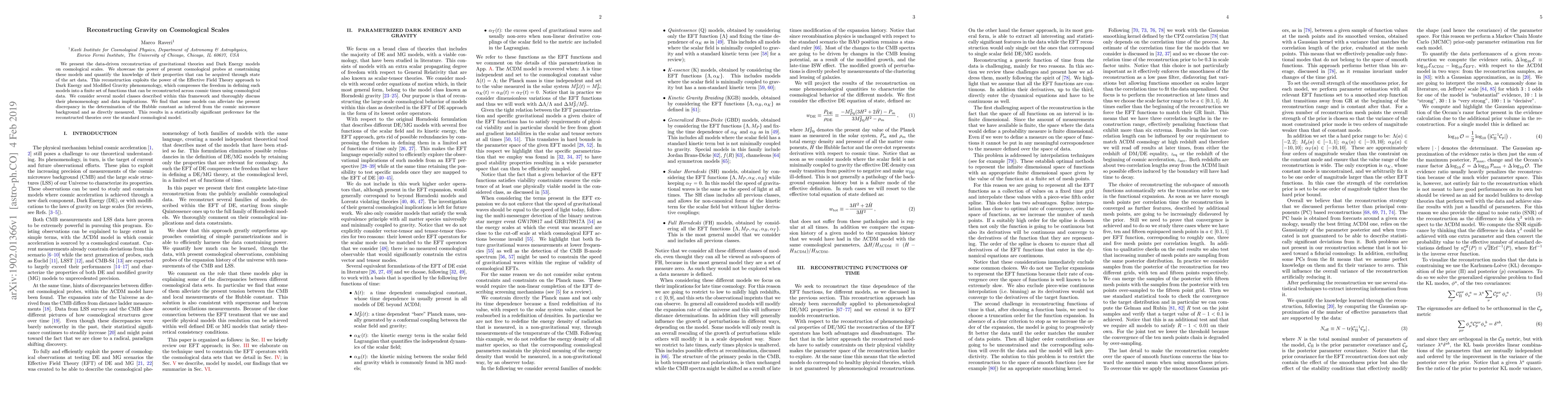 We present the data-driven reconstruction of gravitational theories and Dark Energy models on cosmological scales. We showcase the power of present cosmological probes at constraining these models and quantify the knowledge of their properties that can be acquired through state of the art data. This reconstruction exploits the power of the Effective Field Theory approach to Dark Energy and Modified Gravity phenomenology, which compresses the freedom in defining such models into a finite set of functions that can be reconstructed across cosmic times using cosmological data. We consider several model classes described within this framework and thoroughly discuss their phenomenology and data implications. We find that some models can alleviate the present discrepancy in the determination of the Hubble constant as inferred from the cosmic microwave background and as directly measured. This results in a statistically significant preference for the reconstructed theories over the standard cosmological model.