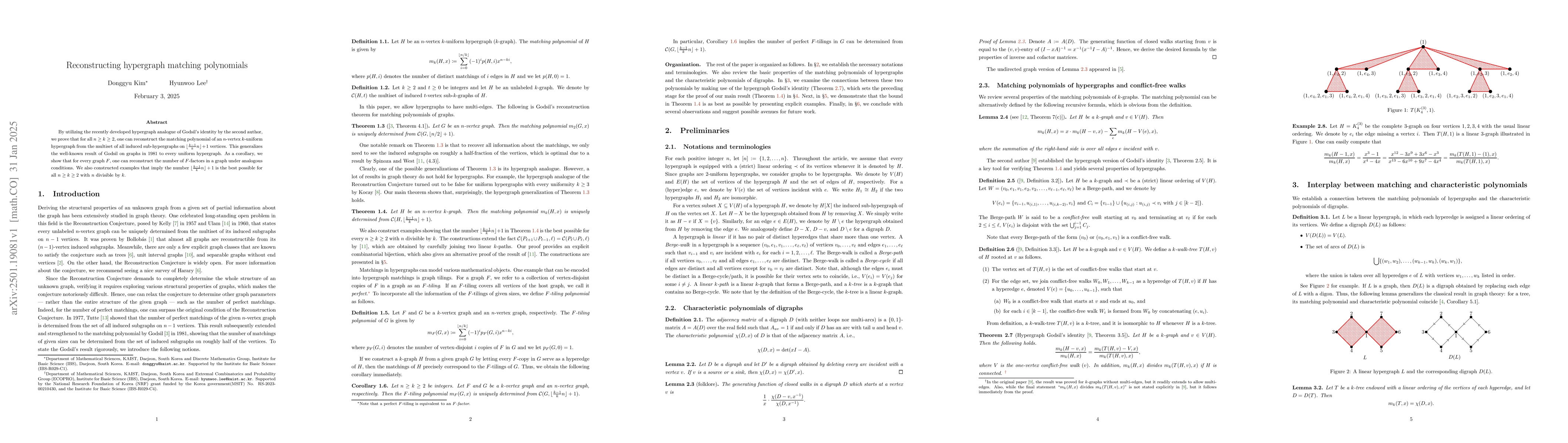 By utilizing the recently developed hypergraph analogue of Godsil's identity by the second author, we prove that for all $n \geq k \geq 2$, one can reconstruct the matching polynomial of an $n$-vertex $k$-uniform hypergraph from the multiset of all induced sub-hypergraphs on $\lfloor \frac{k-1}{k}n \rfloor + 1$ vertices. This generalizes the well-known result of Godsil on graphs in 1981 to every uniform hypergraph. As a corollary, we show that for every graph $F$, one can reconstruct the number of $F$-factors in a graph under analogous conditions. We also constructed examples that imply the number $\lfloor \frac{k-1}{k}n \rfloor + 1$ is the best possible for all $n\geq k \geq 2$ with $n$ divisible by $k$.