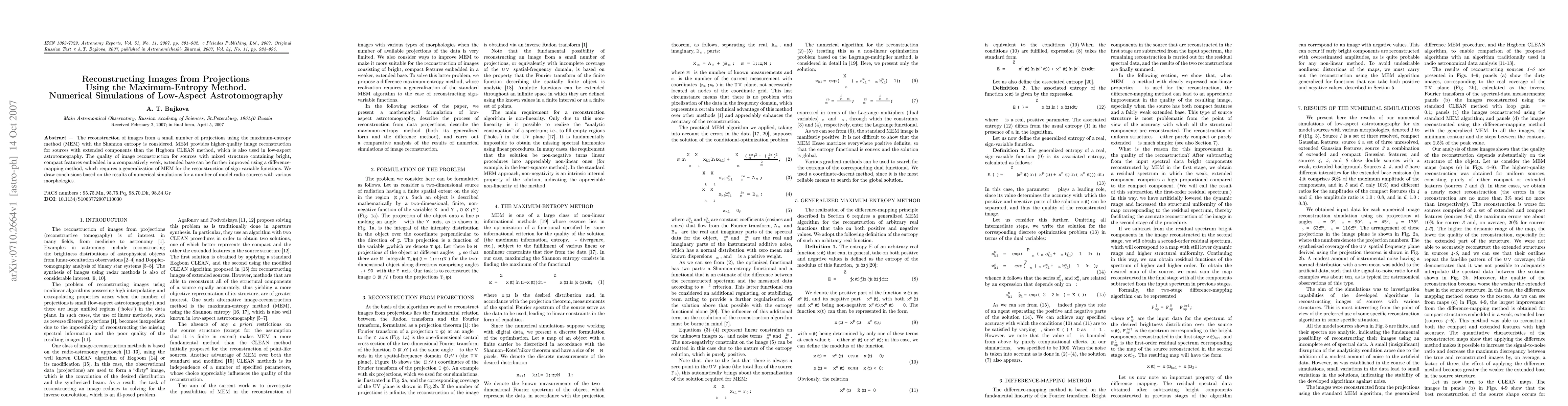 The reconstruction of images from a small number of projections using the maximum-entropy method (MEM) with the Shannon entropy is considered. MEM provides higher-quality image reconstruction for sources with extended components than the Hogbom CLEAN method, which is also used in low-aspect astrotomography. The quality of image reconstruction for sources with mixed structure containing bright, compact features embedded in a comparatively weak, extended base can be further improved using a difference-mapping method, which requires a generalization of MEM for the reconstruction of sign-variable functions.We draw conclusions based on the results of numerical simulations for a number of model radio sources with various morphologies.