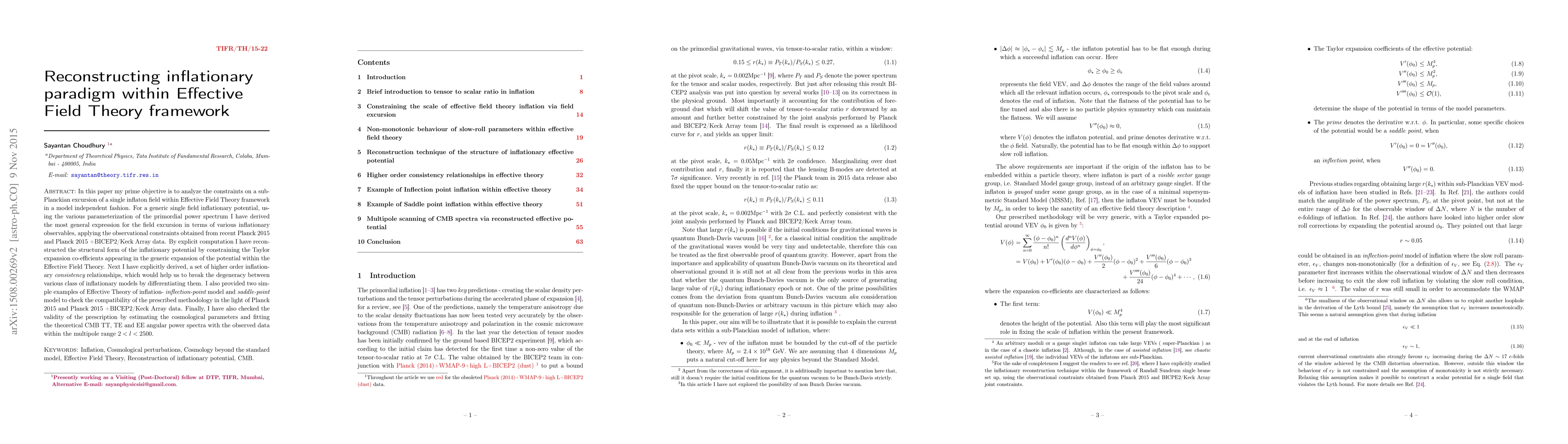 This paper reconstructs the inflationary paradigm within the Effective Field Theory framework by analyzing sub-Planckian inflaton field excursions and deriving general expressions for field excursion in terms of inflationary observables. It validates the methodology using Planck and BICEP2/Keck Array data, and provides examples of inflection-point and saddle-point models to test the approach.