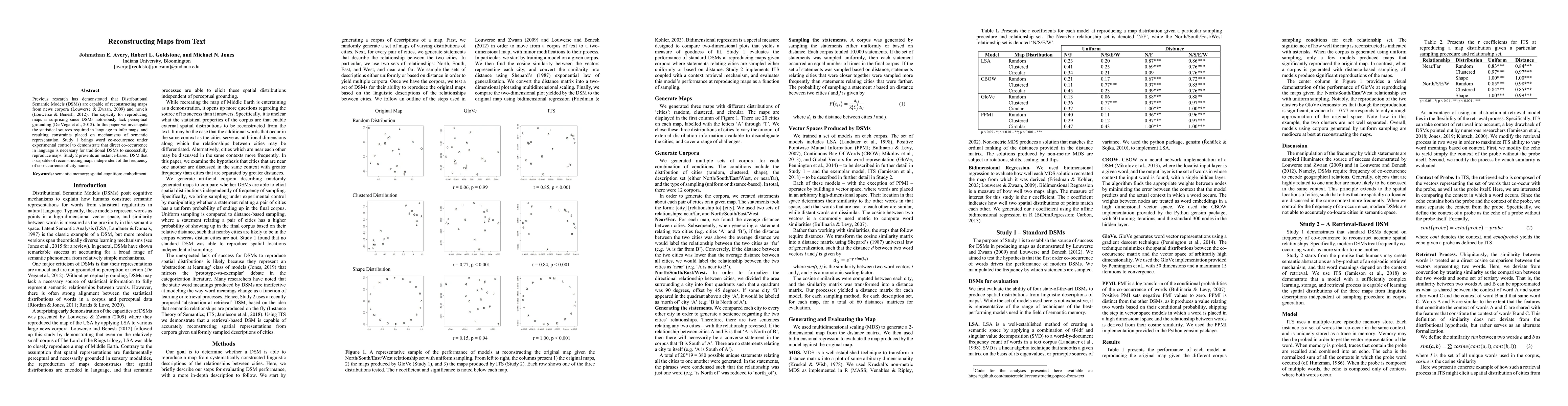 Previous research has demonstrated that Distributional Semantic Models (DSMs) are capable of reconstructing maps from news corpora (Louwerse & Zwaan, 2009) and novels (Louwerse & Benesh, 2012). The capacity for reproducing maps is surprising since DSMs notoriously lack perceptual grounding (De Vega et al., 2012). In this paper we investigate the statistical sources required in language to infer maps, and resulting constraints placed on mechanisms of semantic representation. Study 1 brings word co-occurrence under experimental control to demonstrate that direct co-occurrence in language is necessary for traditional DSMs to successfully reproduce maps. Study 2 presents an instance-based DSM that is capable of reconstructing maps independent of the frequency of co-occurrence of city names.