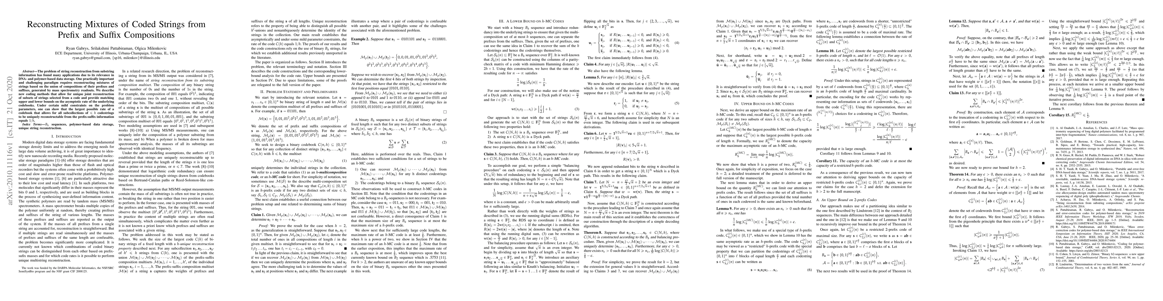 This paper presents novel coding techniques for reconstructing mixtures of coded strings from their prefix and suffix compositions, crucial for applications in DNA and polymer data storage. It establishes upper and lower bounds for the asymptotic rate of these codes, showing that under mild constraints, the optimal rate for reconstructing subsets of strings is $1/h$, where $h$ is the maximum number of codestrings in any subcollection.