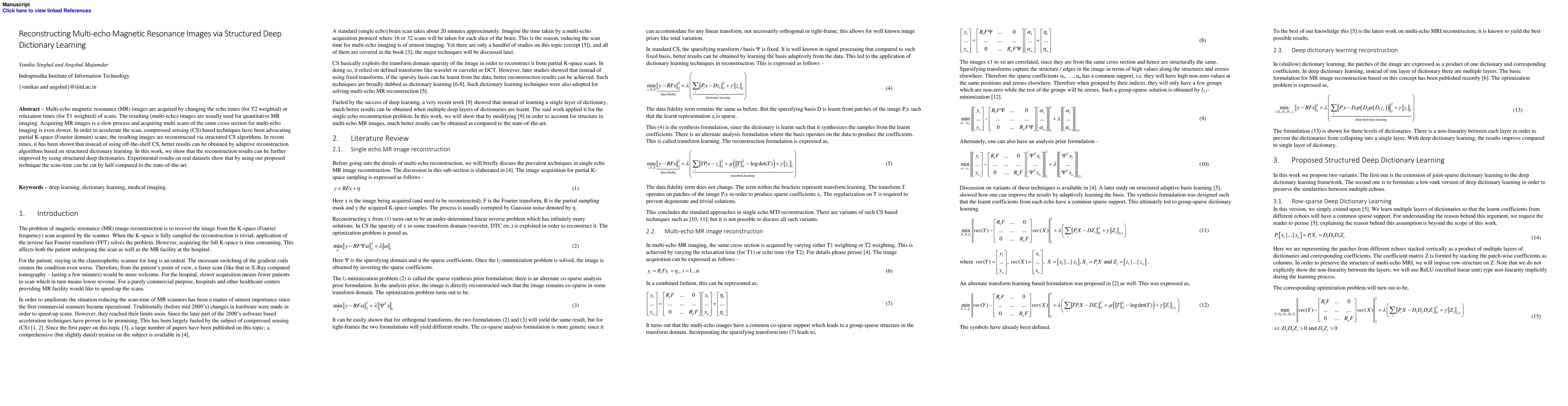 Multi-echo magnetic resonance (MR) images are acquired by changing the echo times (for T2 weighted) or relaxation times (for T1 weighted) of scans. The resulting (multi-echo) images are usually used for quantitative MR imaging. Acquiring MR images is a slow process and acquiring multi scans of the same cross section for multi-echo imaging is even slower. In order to accelerate the scan, compressed sensing (CS) based techniques have been advocating partial K-space (Fourier domain) scans; the resulting images are reconstructed via structured CS algorithms. In recent times, it has been shown that instead of using off-the-shelf CS, better results can be obtained by adaptive reconstruction algorithms based on structured dictionary learning. In this work, we show that the reconstruction results can be further improved by using structured deep dictionaries. Experimental results on real datasets show that by using our proposed technique the scan-time can be cut by half compared to the state-of-the-art.