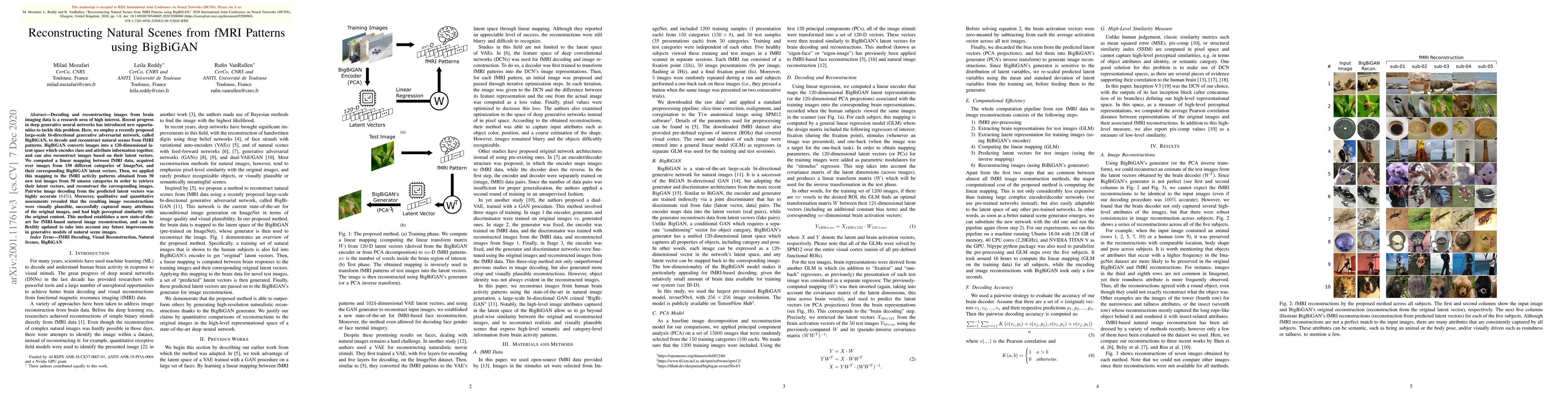 This study uses BigBiGAN to decode and reconstruct natural scenes from fMRI patterns, achieving 84% accuracy in pairwise image decoding. The method successfully reconstructs images from unseen categories, demonstrating high perceptual similarity to the original content.