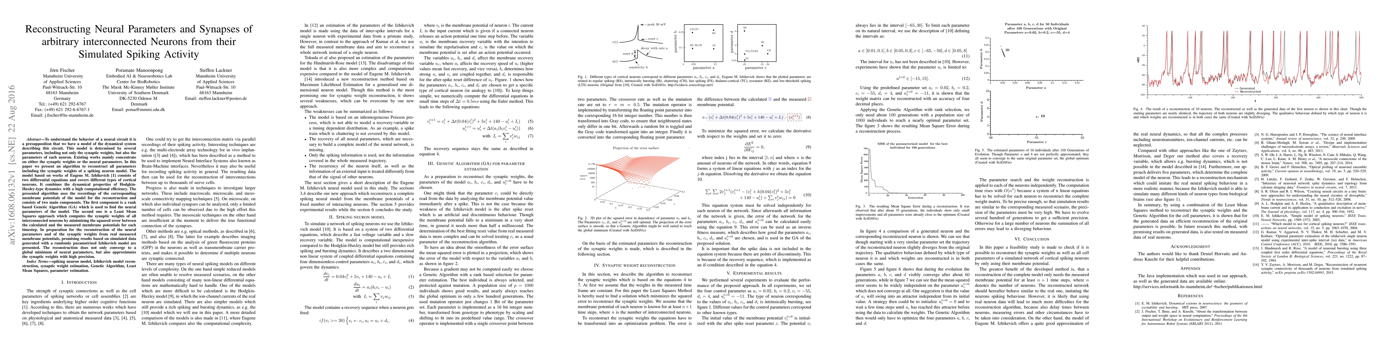 To understand the behavior of a neural circuit it is a presupposition that we have a model of the dynamical system describing this circuit. This model is determined by several parameters, including not only the synaptic weights, but also the parameters of each neuron. Existing works mainly concentrate on either the synaptic weights or the neural parameters. In this paper we present an algorithm to reconstruct all parameters including the synaptic weights of a spiking neuron model. The model based on works of Eugene M. Izhikevich (Izhikevich 2007) consists of two differential equations and covers different types of cortical neurons. It combines the dynamical properties of Hodgkin-Huxley-type dynamics with a high computational efficiency. The presented algorithm uses the recordings of the corresponding membrane potentials of the model for the reconstruction and consists of two main components. The first component is a rank based Genetic Algorithm (GA) which is used to find the neural parameters of the model. The second one is a Least Mean Squares approach which computes the synaptic weights of all interconnected neurons by minimizing the squared error between the calculated and the measured membrane potentials for each time step. In preparation for the reconstruction of the neural parameters and of the synaptic weights from real measured membrane potentials, promising results based on simulated data generated with a randomly parametrized Izhikevich model are presented. The reconstruction does not only converge to a global minimum of neural parameters, but also approximates the synaptic weights with high precision.