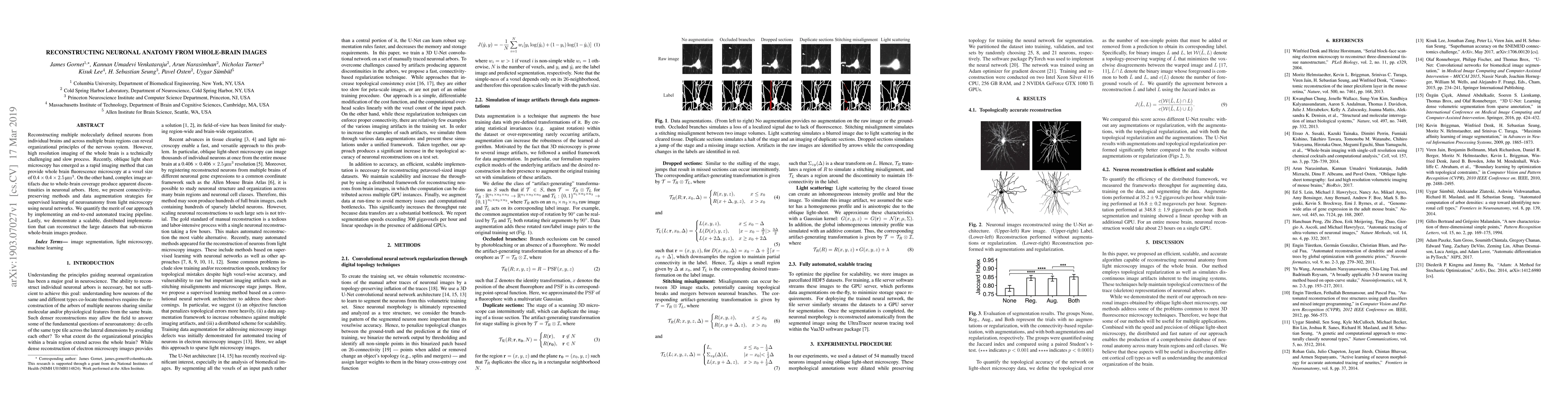 Reconstructing multiple molecularly defined neurons from individual brains and across multiple brain regions can reveal organizational principles of the nervous system. However, high resolution imaging of the whole brain is a technically challenging and slow process. Recently, oblique light sheet microscopy has emerged as a rapid imaging method that can provide whole brain fluorescence microscopy at a voxel size of 0.4 by 0.4 by 2.5 cubic microns. On the other hand, complex image artifacts due to whole-brain coverage produce apparent discontinuities in neuronal arbors. Here, we present connectivity-preserving methods and data augmentation strategies for supervised learning of neuroanatomy from light microscopy using neural networks. We quantify the merit of our approach by implementing an end-to-end automated tracing pipeline. Lastly, we demonstrate a scalable, distributed implementation that can reconstruct the large datasets that sub-micron whole-brain images produce.