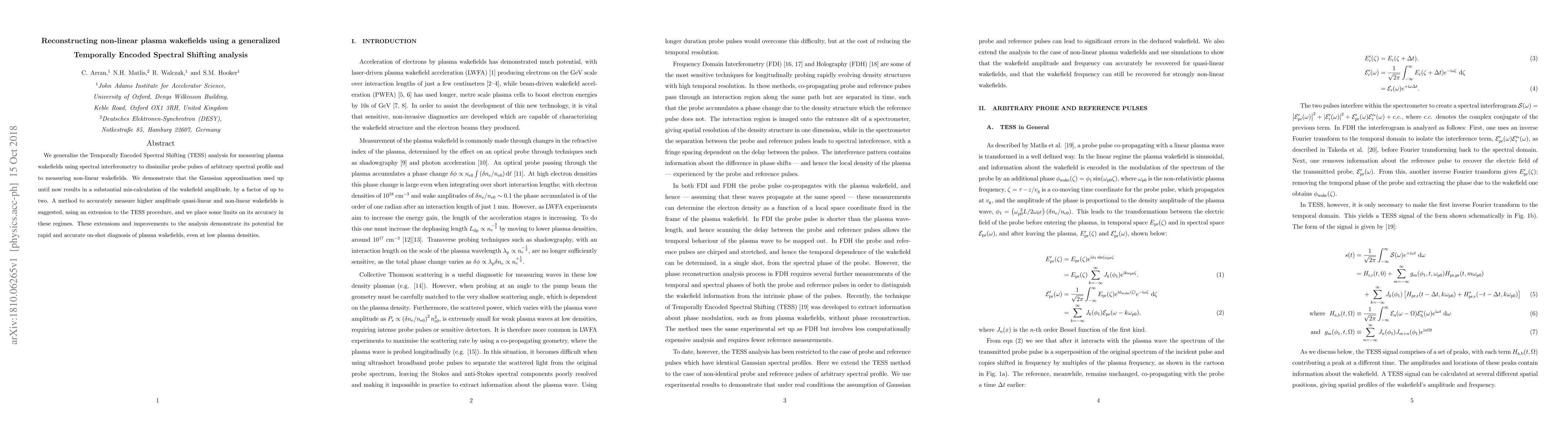 We generalize the temporally encoded spectral shifting (TESS) analysis for measuring plasma wakefields using spectral interferometry to dissimilar probe pulses of arbitrary spectral profile and to measuring nonlinear wakefields. We demonstrate that the Gaussian approximation used up until now results in a substantial miscalculation of the wakefield amplitude, by a factor of up to two. A method to accurately measure higher amplitude quasilinear and nonlinear wakefields is suggested, using an extension to the TESS procedure, and we place some limits on its accuracy in these regimes. These extensions and improvements to the analysis demonstrate its potential for rapid and accurate on-shot diagnosis of plasma wakefields, even at low plasma densities.