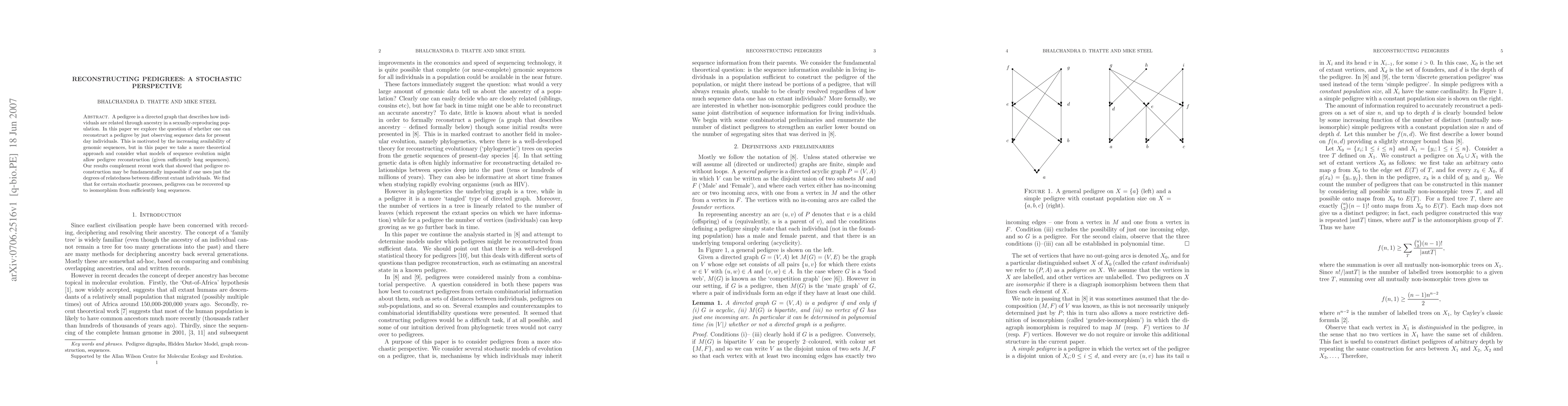 This paper investigates the theoretical possibility of reconstructing pedigrees using genomic sequence data, finding that under certain stochastic sequence evolution models, it is possible to recover pedigrees up to isomorphism with sufficiently long sequences. This complements previous findings that pedigree reconstruction may be fundamentally impossible using only relatedness measures.
