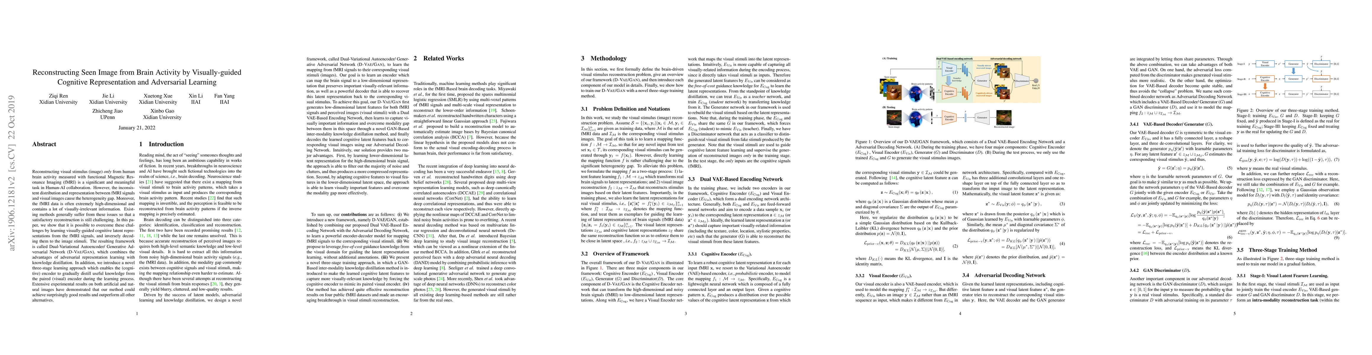 Reconstructing visual stimulus (image) only from human brain activity measured with functional Magnetic Resonance Imaging (fMRI) is a significant and meaningful task in Human-AI collaboration. However, the inconsistent distribution and representation between fMRI signals and visual images cause the heterogeneity gap. Moreover, the fMRI data is often extremely high-dimensional and contains a lot of visually-irrelevant information. Existing methods generally suffer from these issues so that a satisfactory reconstruction is still challenging. In this paper, we show that it is possible to overcome these challenges by learning visually-guided cognitive latent representations from the fMRI signals, and inversely decoding them to the image stimuli. The resulting framework is called Dual-Variational Autoencoder/ Generative Adversarial Network (D-VAE/GAN), which combines the advantages of adversarial representation learning with knowledge distillation. In addition, we introduce a novel three-stage learning approach which enables the (cognitive) encoder to gradually distill useful knowledge from the paired (visual) encoder during the learning process. Extensive experimental results on both artificial and natural images have demonstrated that our method could achieve surprisingly good results and outperform all other alternatives.