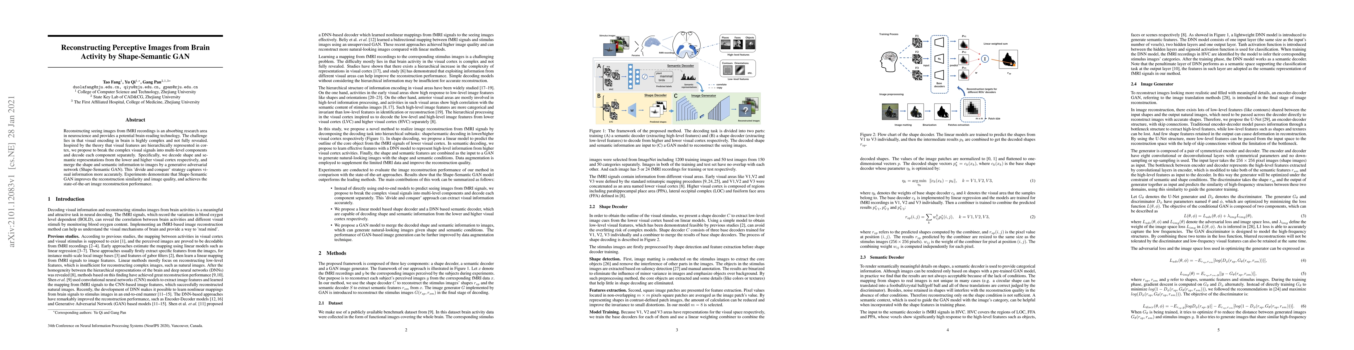 This paper proposes a Shape-Semantic GAN to reconstruct perceptive images from fMRI recordings by decoding shape and semantic representations from different visual cortex levels, merging them to enhance reconstruction accuracy. The method achieves state-of-the-art performance in image reconstruction by leveraging a 'divide and conquer' approach.