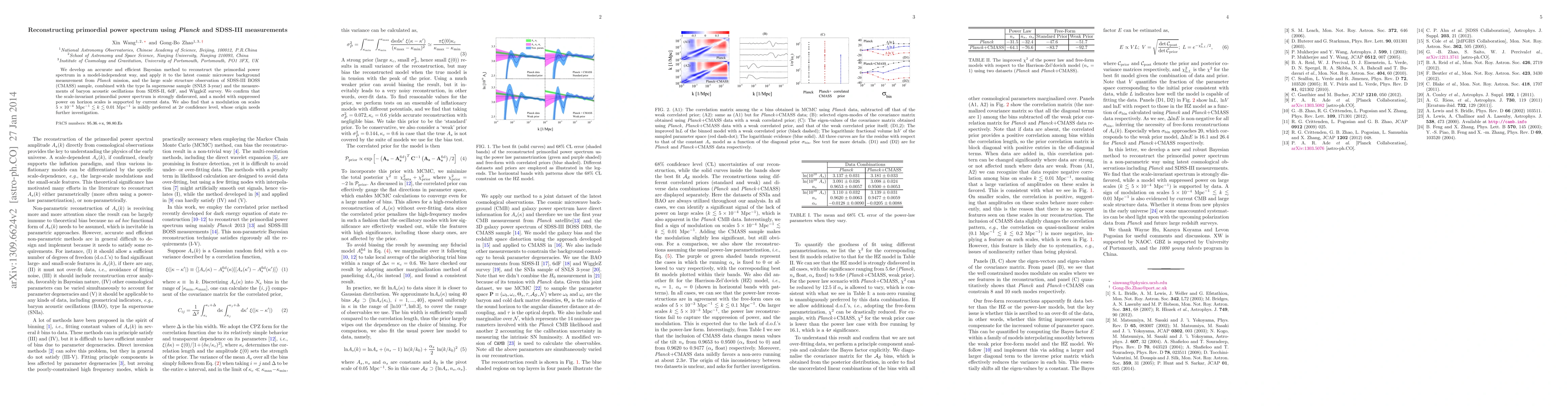 We develop an accurate and efficient Bayesian method to reconstruct the primordial power spectrum in a model-independent way, and apply it to the latest cosmic microwave background measurement from Planck mission, and the large scale structure observation of SDSS-III BOSS (CMASS) sample, combined with the type Ia supernovae sample (SNLS 3-year) and the measurements of baryon acoustic oscillations from SDSS-II, 6dF, and WiggleZ survey. We confirm that the scale-invariant primordial power spectrum is strongly disfavored, and a model with suppressed power on horizon scales is supported by current data. We also find that a modulation on scales $5\times10^{-4}~\textrm{Mpc}^{-1} \lesssim k \lesssim 0.01~\textrm{Mpc}^{-1}$ is mildly preferred at $2\sigma$ confidence level, whose origin needs further investigation.