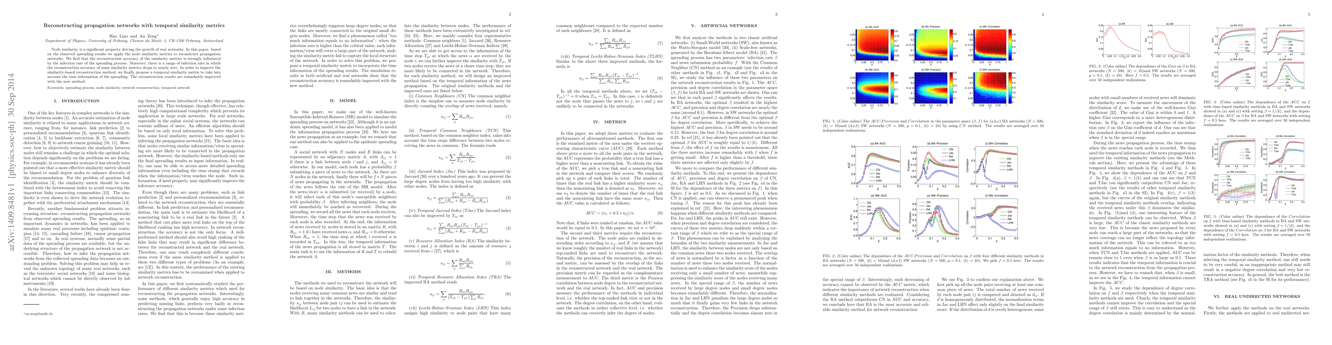 This paper explores the use of node similarity metrics to reconstruct propagation networks from spreading results. It finds that reconstruction accuracy is heavily dependent on the infection rate, with a critical range causing near zero accuracy. To address this, the authors propose a temporal similarity metric incorporating time information, significantly enhancing reconstruction results.