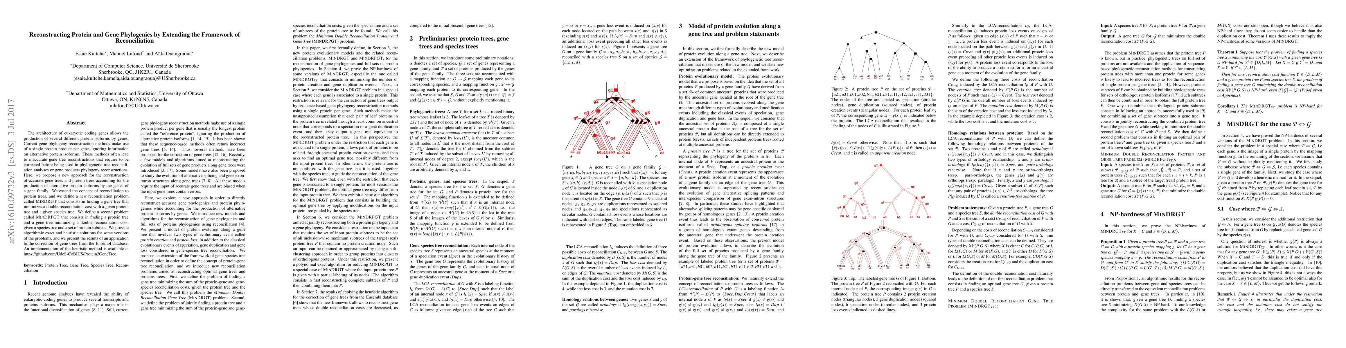 The architecture of eukaryotic coding genes allows the production of several different protein isoforms by genes. Current gene phylogeny reconstruction methods make use of a single protein product per gene, ignoring information on alternative protein isoforms. These methods often lead to inaccurate gene tree reconstructions that require to be corrected before being used in phylogenetic tree reconciliation analyses or gene products phylogeny reconstructions. Here, we propose a new approach for the reconstruction of accurate gene trees and protein trees accounting for the production of alternative protein isoforms by the genes of a gene family. We extend the concept of reconciliation to protein trees, and we define a new reconciliation problem called MinDRGT that consists in finding a gene tree that minimizes a double reconciliation cost with a given protein tree and a given species tree. We define a second problem called MinDRPGT that consists in finding a protein tree and a gene tree minimizing a double reconciliation cost, given a species tree and a set of protein subtrees. We provide algorithmic exact and heuristic solutions for some versions of the problems, and we present the results of an application to the correction of gene trees from the Ensembl database. An implementation of the heuristic method is available at https://github.com/UdeS-CoBIUS/Protein2GeneTree.