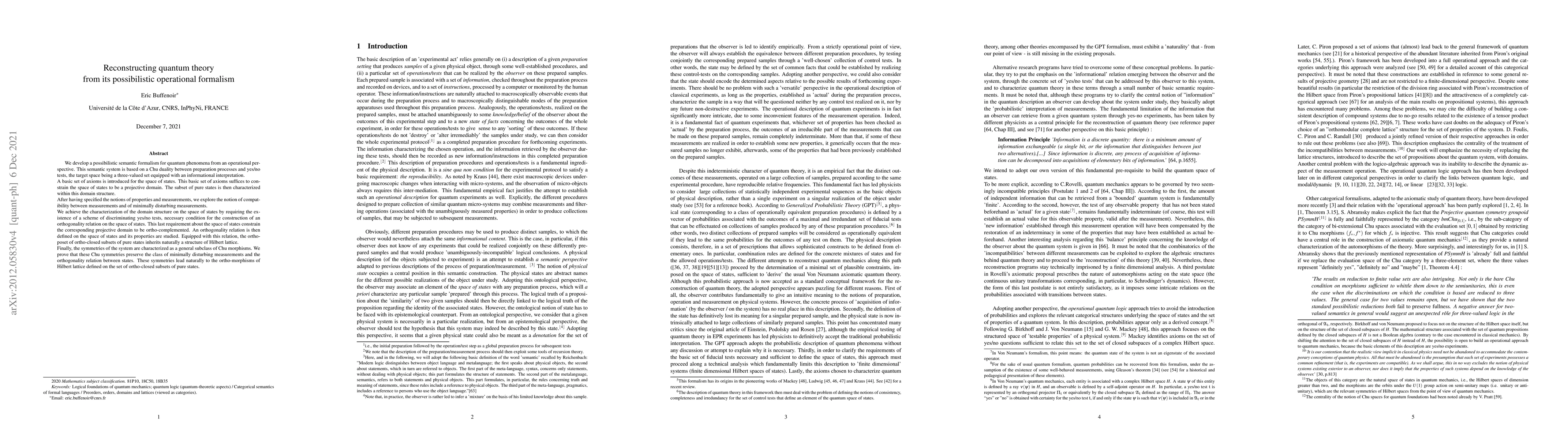 We develop a possibilistic semantic formalism for quantum phenomena from an operational perspective. This semantic system is based on a Chu duality between preparation processes and yes/no tests, the target space being a three-valued set equipped with an informational interpretation. A basic set of axioms is introduced for the space of states. This basic set of axioms suffices to constrain the space of states to be a projective domain. The subset of pure states is then characterized within this domain structure. After having specified the notions of properties and measurements, we explore the notion of compatibility between measurements and of minimally disturbing measurements. We achieve the characterization of the domain structure on the space of states by requiring the existence of a scheme of discriminating yes/no tests, necessary condition for the construction of an orthogonality relation on the space of states. This last requirement about the space of states constrain the corresponding projective domain to be ortho-complemented. An orthogonality relation is then defined on the space of states and its properties are studied. Equipped with this relation, the ortho-poset of ortho-closed subsets of pure states inherits naturally a structure of Hilbert lattice. Finally, the symmetries of the system are characterized as a general subclass of Chu morphisms. We prove that these Chu symmetries preserve the class of minimally disturbing measurements and the orthogonality relation between states. These symmetries lead naturally to the ortho-morphisms of Hilbert lattice defined on the set of ortho-closed subsets of pure states.