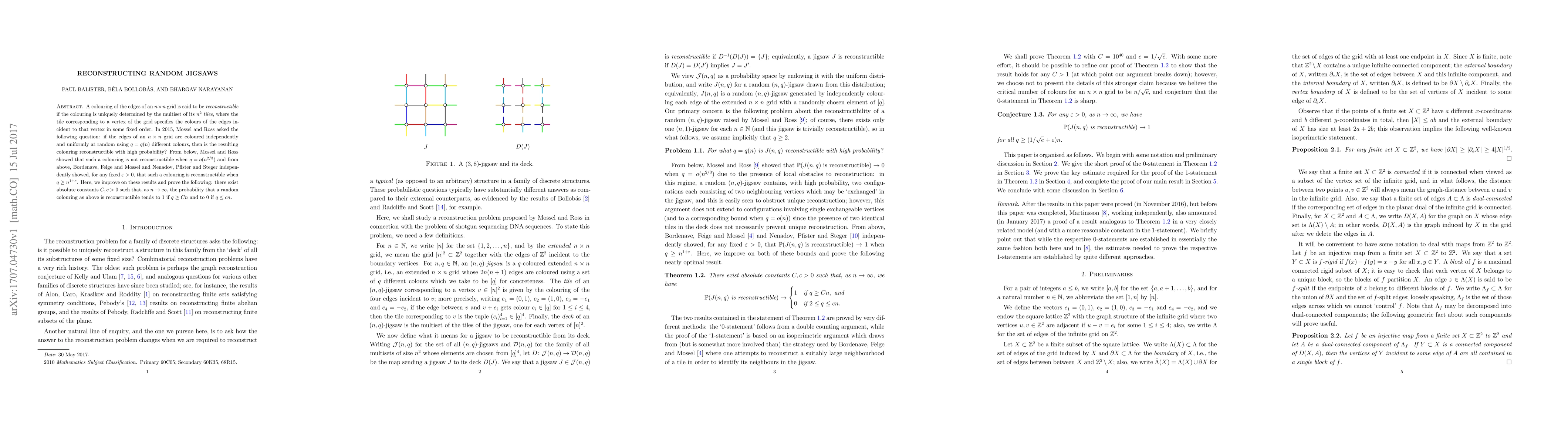 A colouring of the edges of an $n \times n$ grid is said to be \emph{reconstructible} if the colouring is uniquely determined by the multiset of its $n^2$ \emph{tiles}, where the tile corresponding to a vertex of the grid specifies the colours of the edges incident to that vertex in some fixed order. In 2015, Mossel and Ross asked the following question: if the edges of an $n \times n$ grid are coloured independently and uniformly at random using $q=q(n)$ different colours, then is the resulting colouring reconstructible with high probability? From below, Mossel and Ross showed that such a colouring is not reconstructible when $q = o(n^{2/3})$ and from above, Bordenave, Feige and Mossel and Nenadov, Pfister and Steger independently showed, for any fixed $\epsilon > 0$, that such a colouring is reconstructible when $q \ge n^{1+\epsilon}$. Here, we improve on these results and prove the following: there exist absolute constants $C, c > 0$ such that, as $n \to \infty$, the probability that a random colouring as above is reconstructible tends to $1$ if $q \ge Cn$ and to $0$ if $q \le cn$.