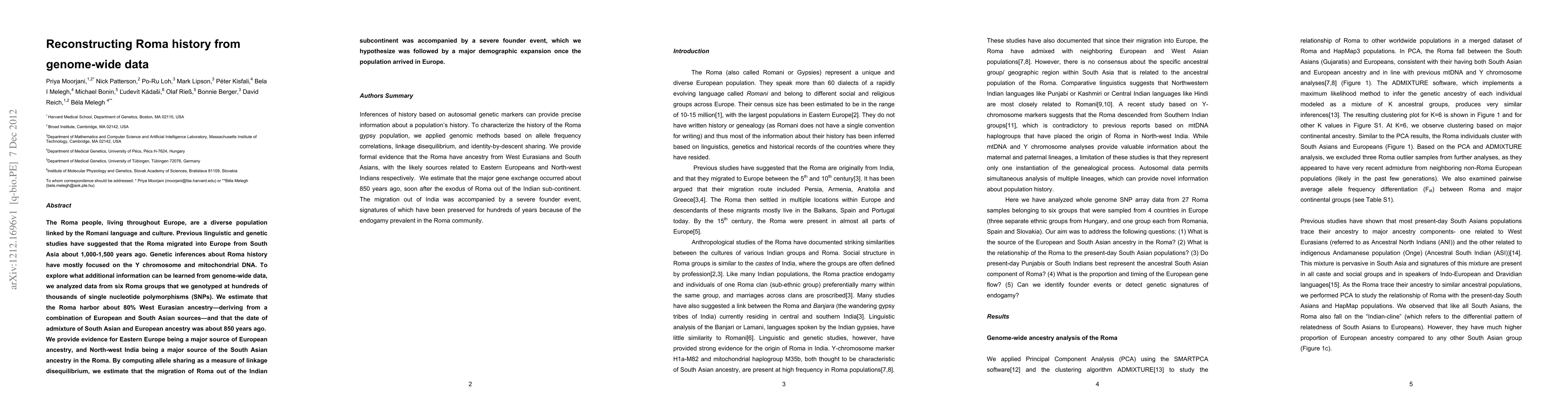 The Roma people, living throughout Europe, are a diverse population linked by the Romani language and culture. Previous linguistic and genetic studies have suggested that the Roma migrated into Europe from South Asia about 1000-1500 years ago. Genetic inferences about Roma history have mostly focused on the Y chromosome and mitochondrial DNA. To explore what additional information can be learned from genome-wide data, we analyzed data from six Roma groups that we genotyped at hundreds of thousands of single nucleotide polymorphisms (SNPs). We estimate that the Roma harbor about 80% West Eurasian ancestry-deriving from a combination of European and South Asian sources- and that the date of admixture of South Asian and European ancestry was about 850 years ago. We provide evidence for Eastern Europe being a major source of European ancestry, and North-west India being a major source of the South Asian ancestry in the Roma. By computing allele sharing as a measure of linkage disequilibrium, we estimate that the migration of Roma out of the Indian subcontinent was accompanied by a severe founder event, which we hypothesize was followed by a major demographic expansion once the population arrived in Europe.