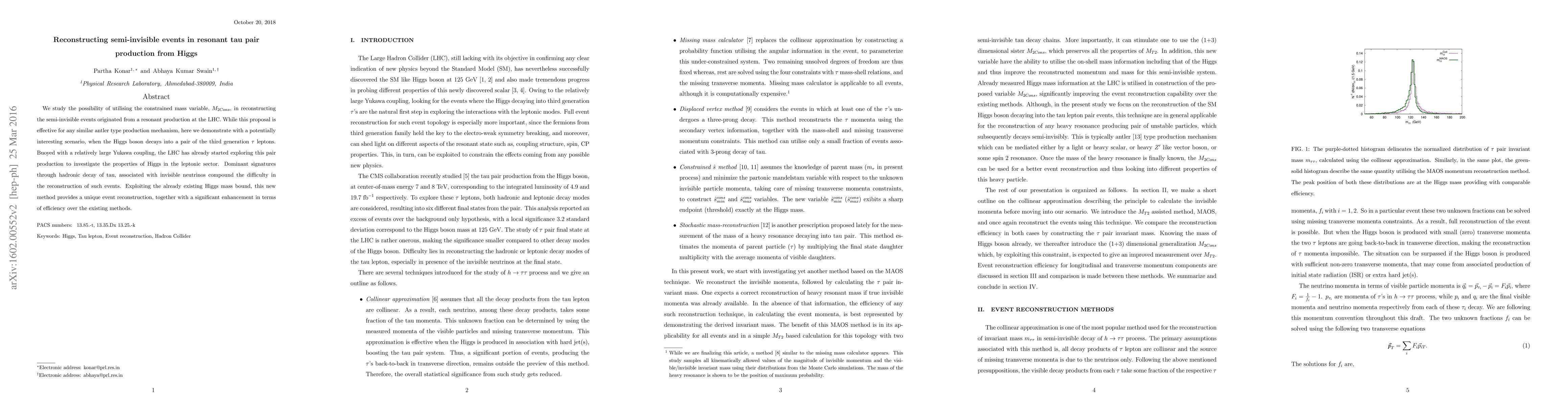This paper proposes a new method for reconstructing semi-invisible events from resonant tau pair production via the Higgs boson at the LHC, utilizing the constrained mass variable $M_{2Cons}$. This approach enhances event reconstruction efficiency, especially in scenarios where tau leptons decay hadronically and produce invisible neutrinos.