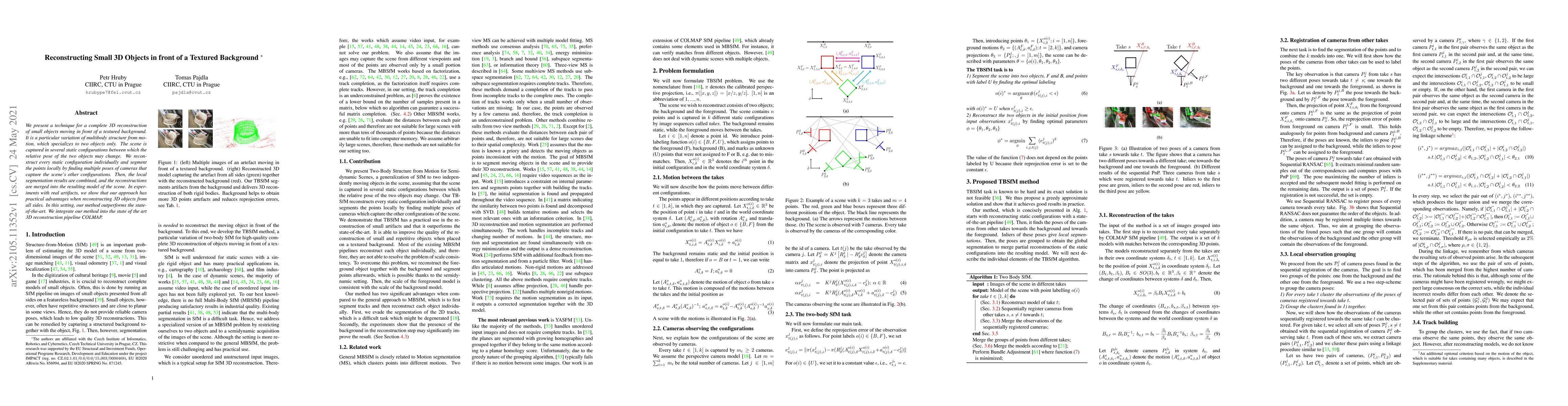 We present a technique for a complete 3D reconstruction of small objects moving in front of a textured background. It is a particular variation of multibody structure from motion, which specializes to two objects only. The scene is captured in several static configurations between which the relative pose of the two objects may change. We reconstruct every static configuration individually and segment the points locally by finding multiple poses of cameras that capture the scene's other configurations. Then, the local segmentation results are combined, and the reconstructions are merged into the resulting model of the scene. In experiments with real artifacts, we show that our approach has practical advantages when reconstructing 3D objects from all sides. In this setting, our method outperforms the state-of-the-art. We integrate our method into the state of the art 3D reconstruction pipeline COLMAP.