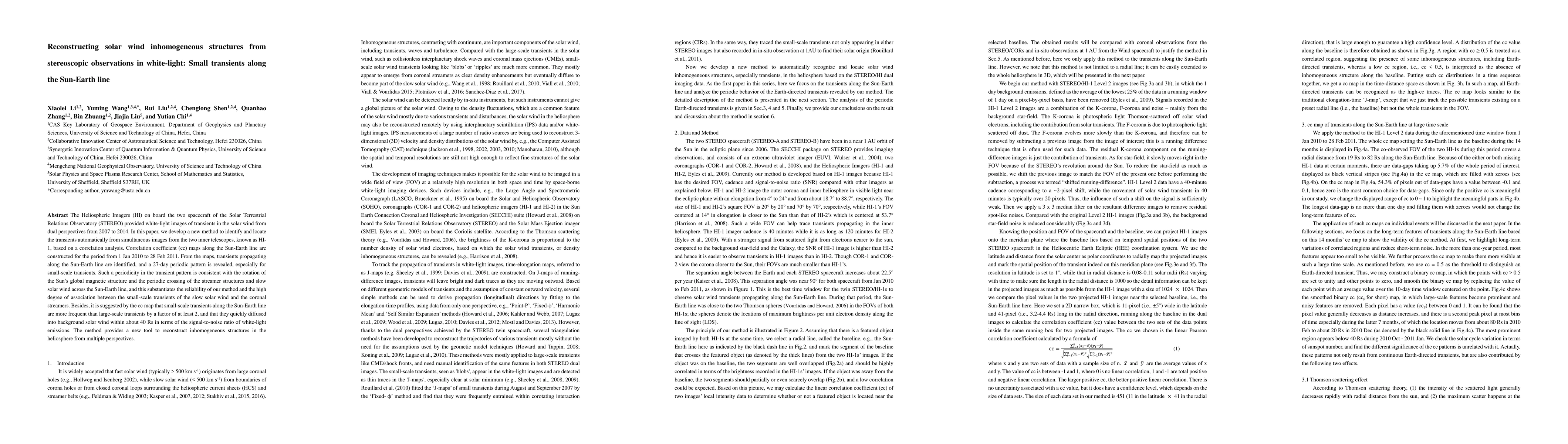 The Heliospheric Imagers (HI) on board the two spacecraft of the Solar Terrestrial Relations Observatory (STEREO) provided white-light images of transients in the solar wind from dual perspectives from 2007 to 2014. In this paper, we develop a new method to identify and locate the transients automatically from simultaneous images from the two inner telescopes, known as HI-1, based on a correlation analysis. Correlation coefficient (cc) maps along the Sun-Earth line are constructed for the period from 1 Jan 2010 to 28 Feb 2011. From the maps, transients propagating along the Sun-Earth line are identified, and a 27-day periodic pattern is revealed, especially for small-scale transients. Such a periodicity in the transient pattern is consistent with the rotation of the Sun's global magnetic structure and the periodic crossing of the streamer structures and slow solar wind across the Sun-Earth line, and this substantiates the reliability of our method and the high degree of association between the small-scale transients of the slow solar wind and the coronal streamers. Besides, it is suggested by the cc map that small-scale transients along the Sun-Earth line are more frequent than large-scale transients by a factor of at least 2, and that they quickly diffused into background solar wind within about 40 Rs in terms of the signal-to-noise ratio of white-light emissions. The method provides a new tool to reconstruct inhomogeneous structures in the heliosphere from multiple perspectives.
