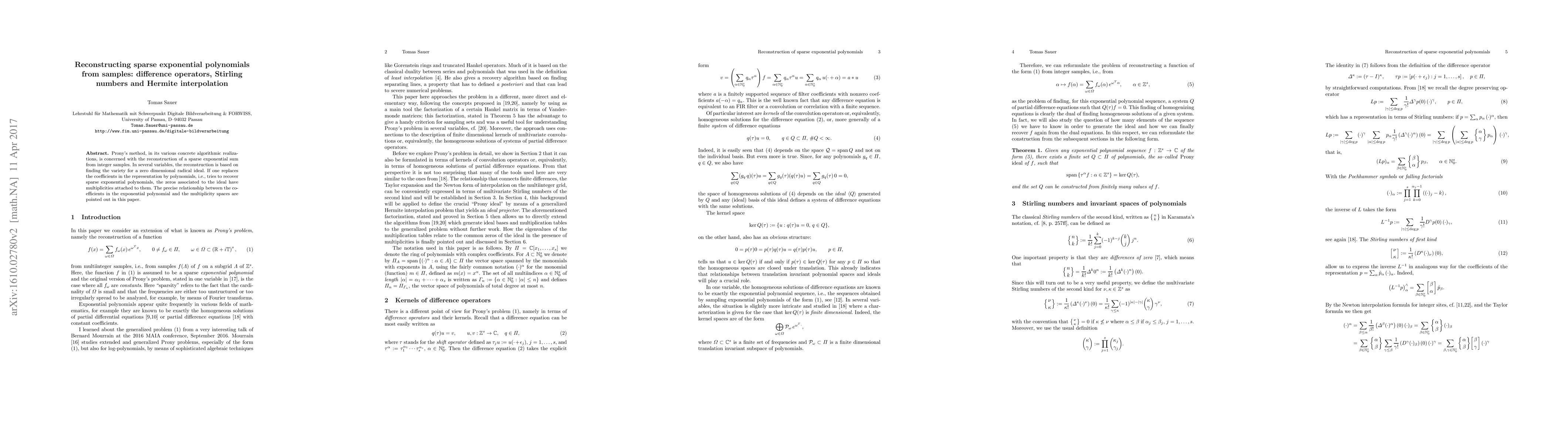Researchers develop a method to reconstruct sparse exponential polynomials from integer samples using Stirling numbers and Hermite interpolation. This approach improves upon existing reconstruction techniques by accounting for multiplicity spaces associated with the zeros of a zero-dimensional radical ideal.