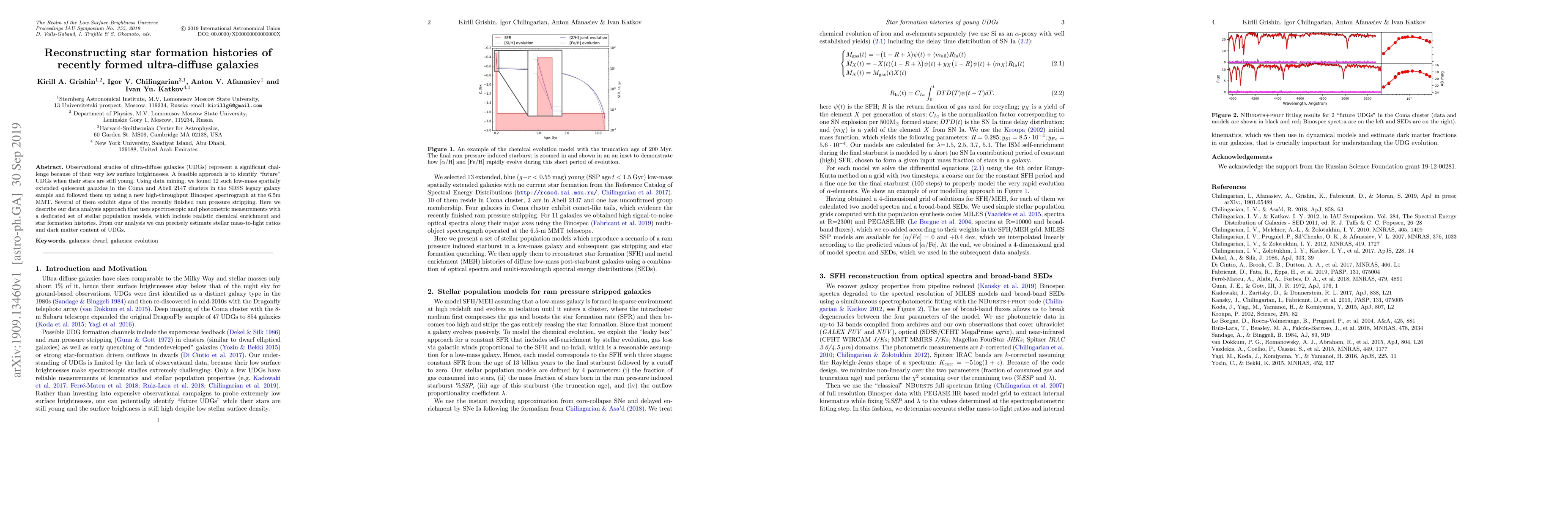 Observational studies of ultra-diffuse galaxies (UDGs) represent a significant challenge because of their very low surface brightnesses. A feasible approach is to identify "future" UDGs when their stars are still young. Using data mining, we found 12 such low-mass spatially extended quiescent galaxies in the Coma and Abell 2147 clusters in the SDSS legacy galaxy sample and followed them up using a new high-throughput Binospec spectrograph at the 6.5m MMT. Several of them exhibit signs of the recently finished ram pressure stripping. Here we describe our data analysis approach that uses spectroscopic and photometric measurements with a dedicated set of stellar population models, which include realistic chemical enrichment and star formation histories. From our analysis we can precisely estimate stellar mass-to-light ratios and dark matter content of UDGs.
