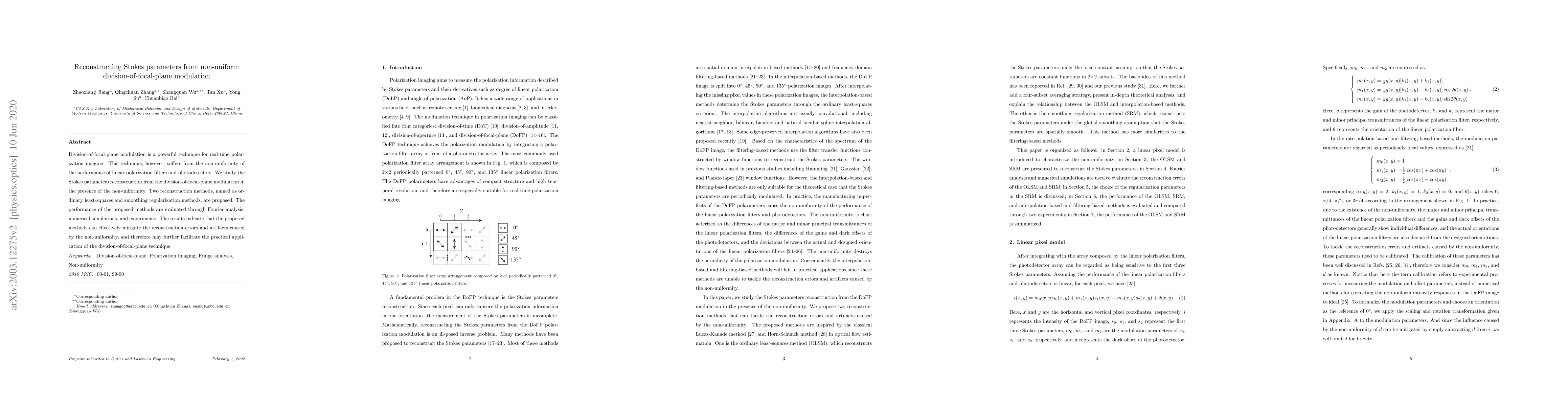 This paper proposes two methods—least-squares and smoothing regularization—to reconstruct Stokes parameters for real-time polarization imaging using division-of-focal-plane modulation, addressing non-uniformity issues in filters and photodetectors. Evaluation through Fourier analysis, simulations, and experiments shows these methods effectively reduce reconstruction errors and artifacts.