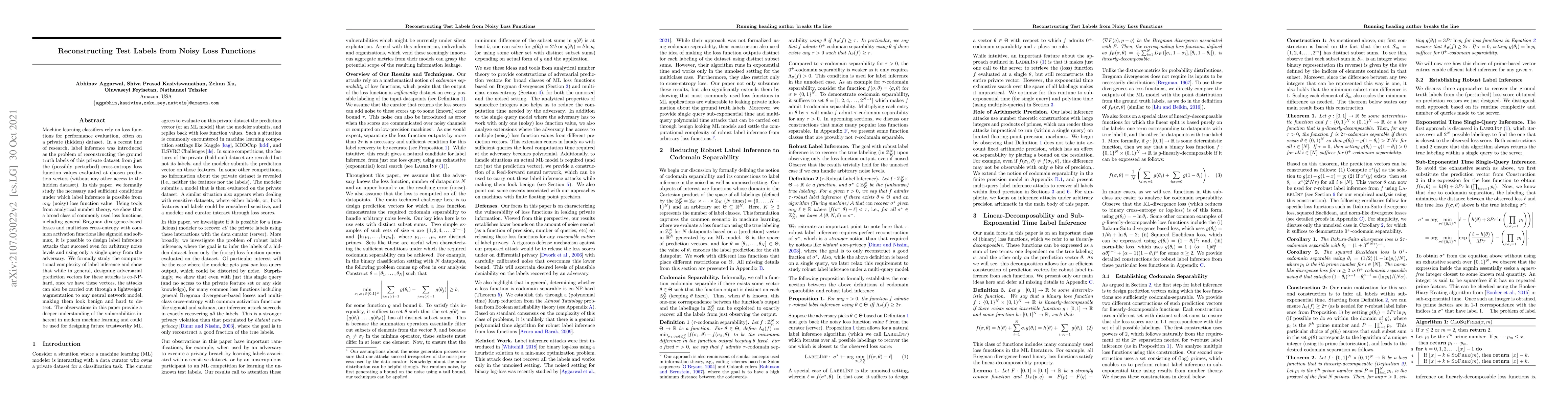 Machine learning classifiers rely on loss functions for performance evaluation, often on a private (hidden) dataset. In a recent line of research, label inference was introduced as the problem of reconstructing the ground truth labels of this private dataset from just the (possibly perturbed) cross-entropy loss function values evaluated at chosen prediction vectors (without any other access to the hidden dataset). In this paper, we formally study the necessary and sufficient conditions under which label inference is possible from \emph{any} (noisy) loss function value. Using tools from analytical number theory, we show that a broad class of commonly used loss functions, including general Bregman divergence-based losses and multiclass cross-entropy with common activation functions like sigmoid and softmax, it is possible to design label inference attacks that succeed even for arbitrary noise levels and using only a single query from the adversary. We formally study the computational complexity of label inference and show that while in general, designing adversarial prediction vectors for these attacks is co-NP-hard, once we have these vectors, the attacks can also be carried out through a lightweight augmentation to any neural network model, making them look benign and hard to detect. The observations in this paper provide a deeper understanding of the vulnerabilities inherent in modern machine learning and could be used for designing future trustworthy ML.
