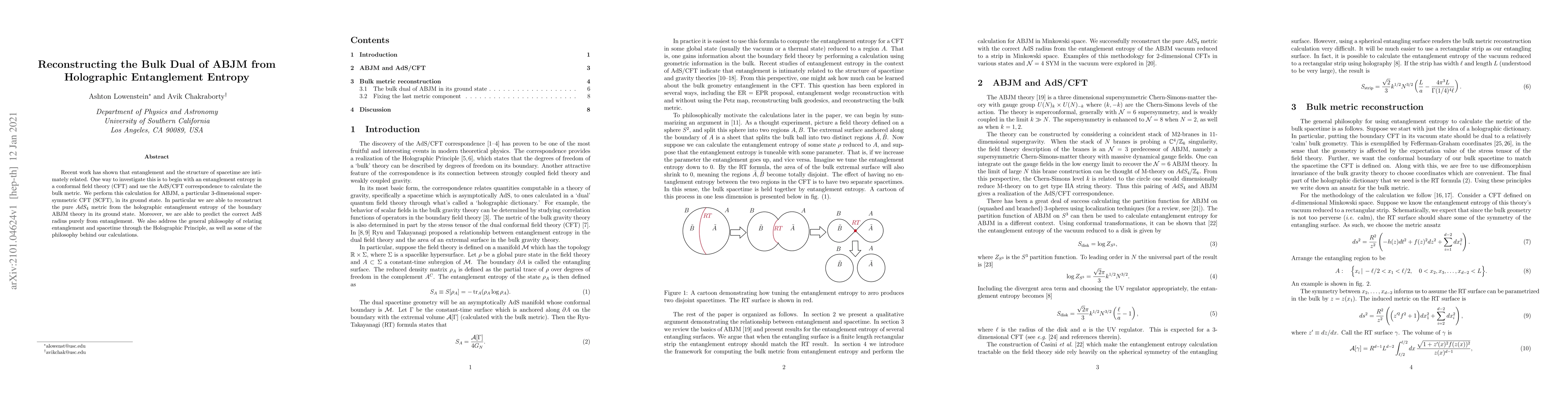 Recent work has shown that entanglement and the structure of spacetime are intimately related. One way to investigate this is to begin with an entanglement entropy in a conformal field theory (CFT) and use the AdS/CFT correspondence to calculate the bulk metric. We perform this calculation for ABJM, a particular 3-dimensional supersymmetric CFT (SCFT), in its ground state. In particular we are able to reconstruct the pure AdS4 metric from the holographic entanglement entropy of the boundary ABJM theory in its ground state. Moreover, we are able to predict the correct AdS radius purely from entanglement. We also address the general philosophy of relating entanglement and spacetime through the Holographic Principle, as well as some of the philosophy behind our calculations.